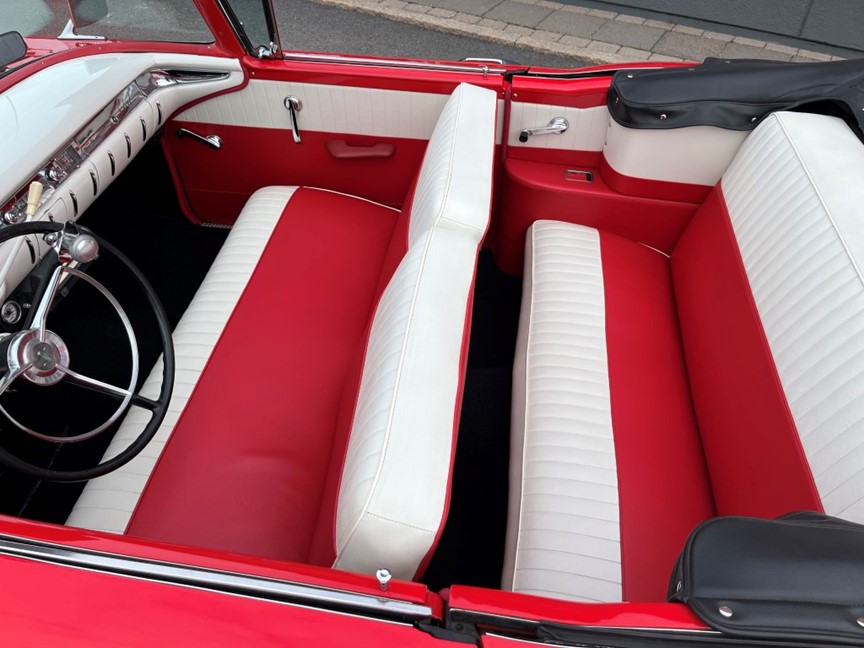 OBS Tillverkad i endast 1.343 exemplar var top of the line. Röd läcker bil som man inte ser på varje träff! Renoverad bil i mycket bra skick. Utrustad med V8. Automat. Servostyrning. Servobromsar. Continental kit. Dubbla ytterspeglar. Tonade rutor. White Walls däck. Option navkapslar. Tröskel lister. Dubbelt avgassystem. Original radio. Modern stereo monterat i en kopia av Philips skivspottare. Förstärkare lite rejälare ljudpaket i bagage. Cabskydd. Hi Jackers. Bagagerumsbelysning. Fenderskirts finns lösa i bagage för den som vill montera dessa. Ovanlig bil från toppåret 1959, inte ofta man ser någon till salu…mycket bil för pengarna! Nya whitewalls däck nytt på platsbyggt dubbelt avgassystem.