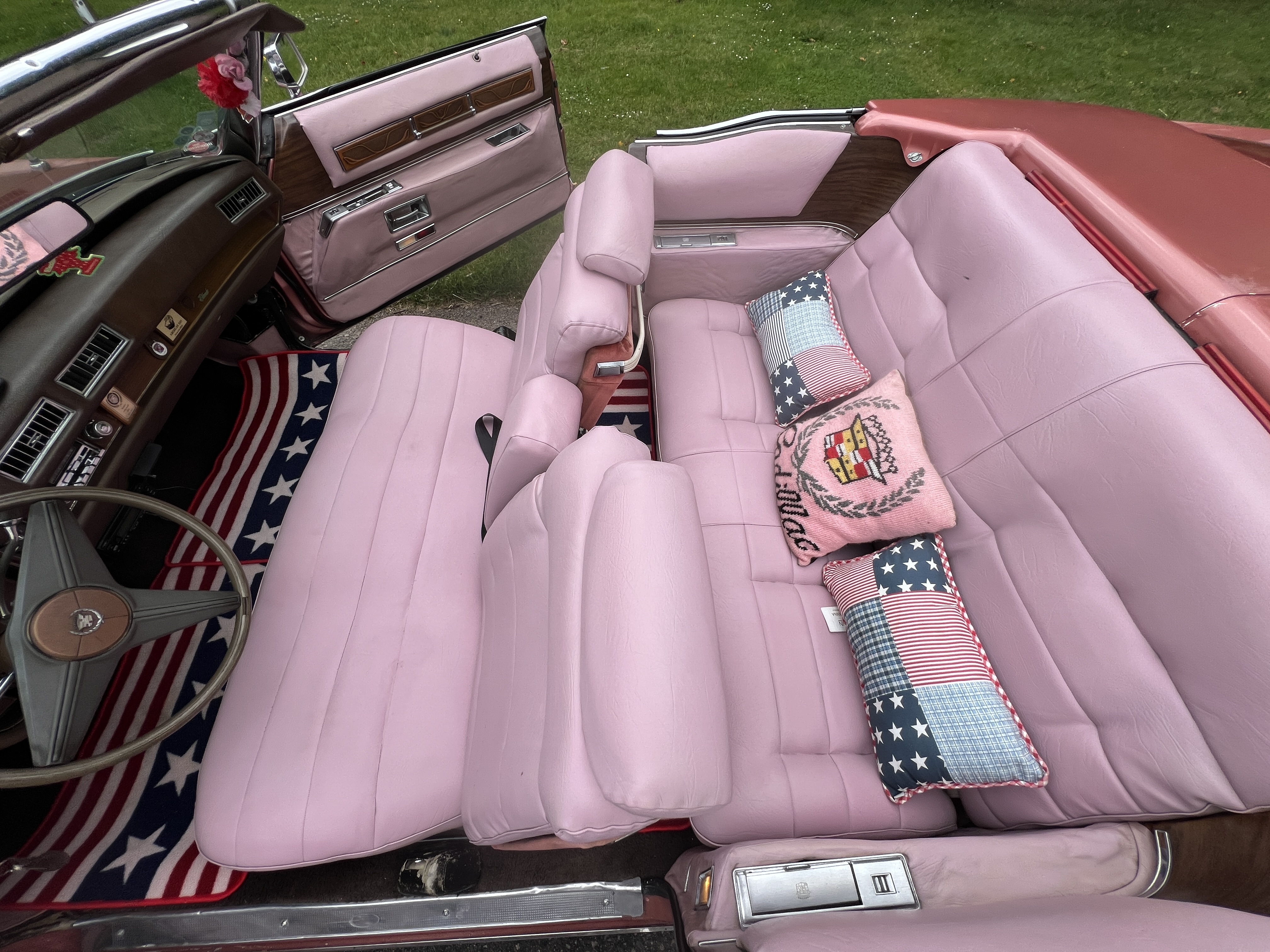Den anlände Sverige 1988 och har haft samme ägare sedan 1993. Den är i ett lysande fint bruksskick. Lacken i läckra Cerise Firemist Metallic samt kromet är glänsande blankt och fint. Inredningen är hel och bra, dock skulle man kanske vilja rätta till vinylen på dörrpanelerna. Det ser riktigt bra ut i motor- och bagagerum samt undertill. Den är underbart komfortabel att köra med sin 8, 2 liters 500 på 190 pigga. Den är inget för den blyge... med sin over-the-top-look kan jag lova att den sticker ut bland alla andra på sommarens träffar, inte minst tack vare Hollywood-kitet och tjurhornet i fronten. Ring mig direkt på 0703158080, ta på din Stetson och kom för en skön provtur!..