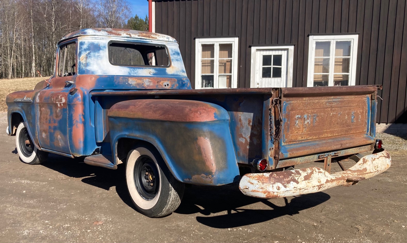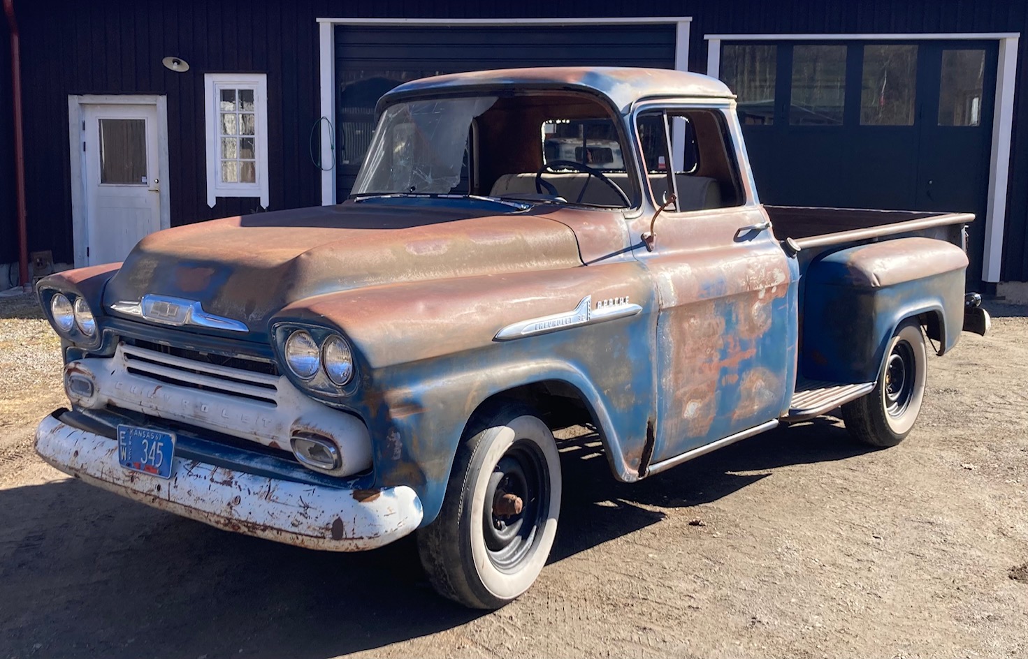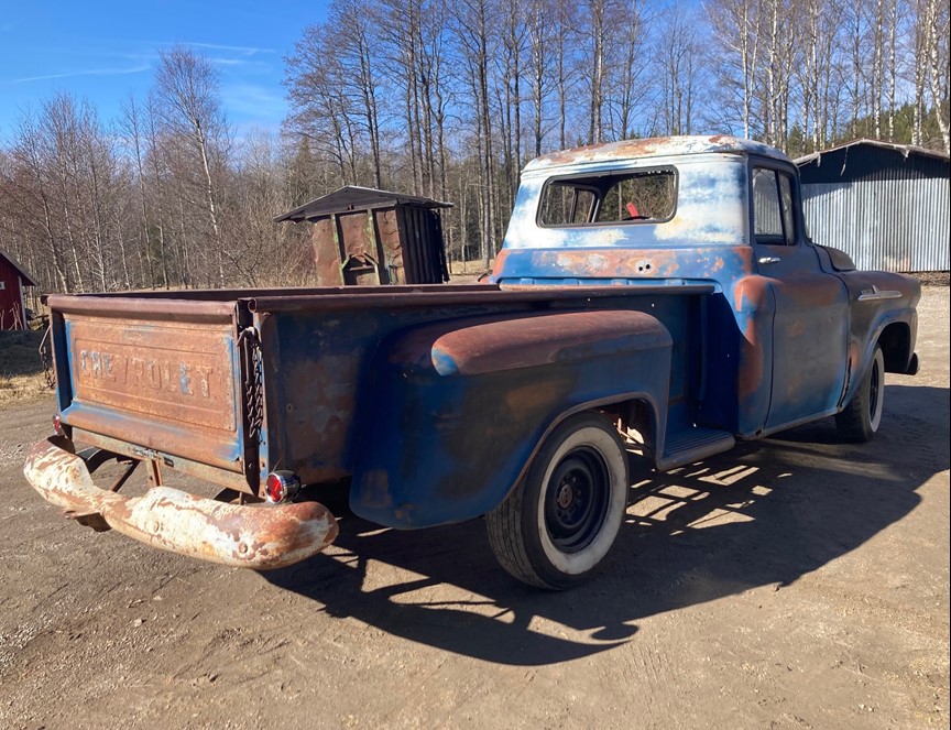 1958 Chevrolet Apache 3200 Halvton Stepside Pickup Ny importerad gött solbakad och mycket välbehållen arbetshäst som tjänstgjort på en farm i västra torra Kansas Ej fungerande men original drivlina sitter kvar i bilen Alla papper finns för registrering hjälper till med ursprungskontroll osv Finans med My Money kan ordnas Hemtransport kan arrangeras Fler bilder kan mailas