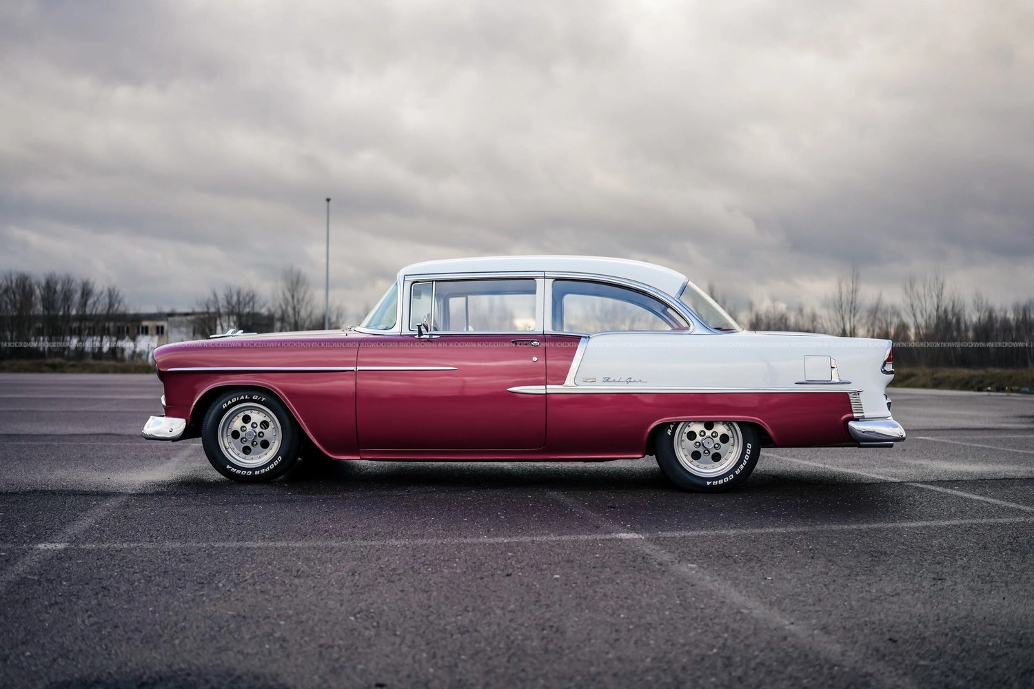 Till salu En Chevrolet Bel Air 2400C från 1955 i färgkombinationen Burgundy-White med röd tyginteriör.