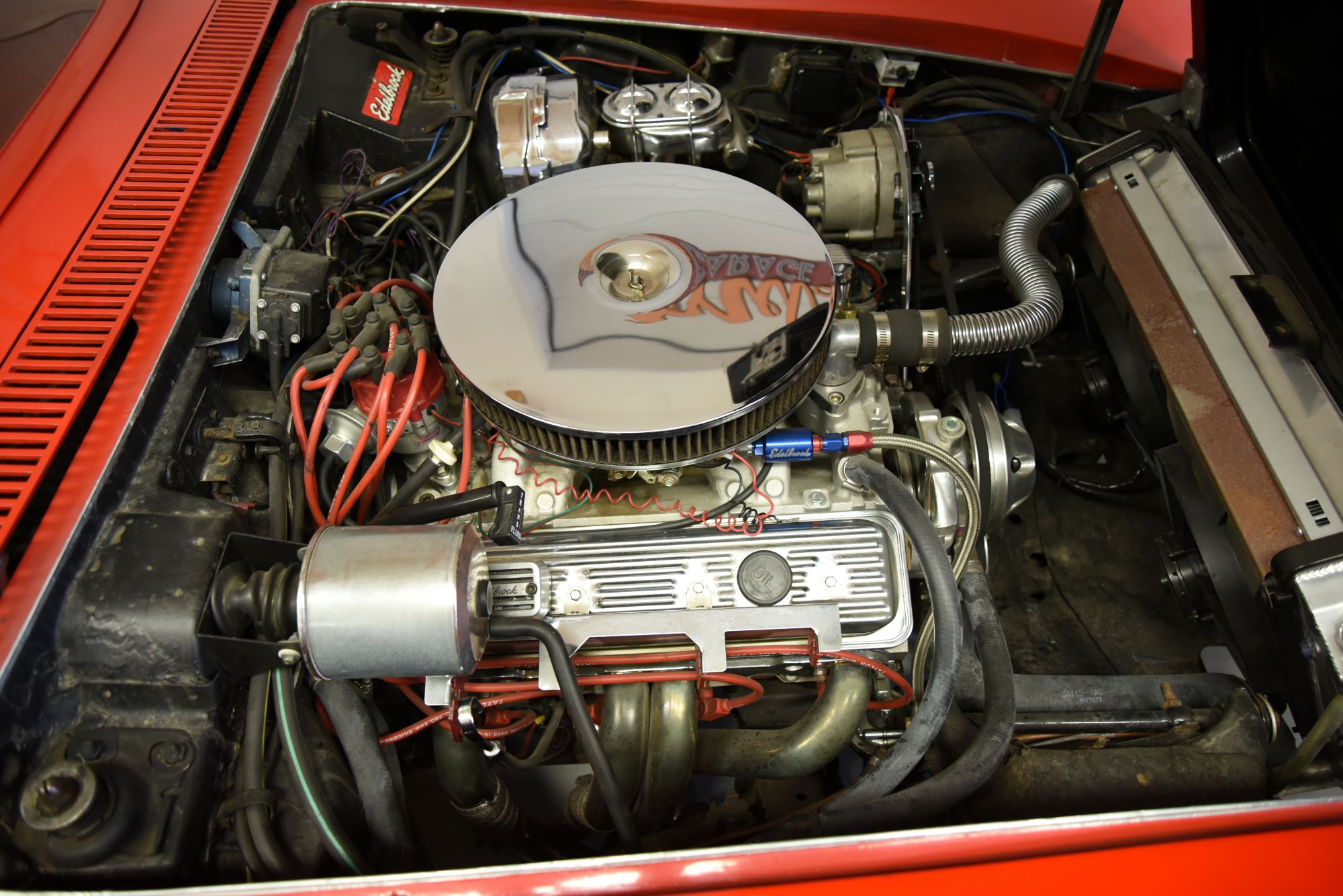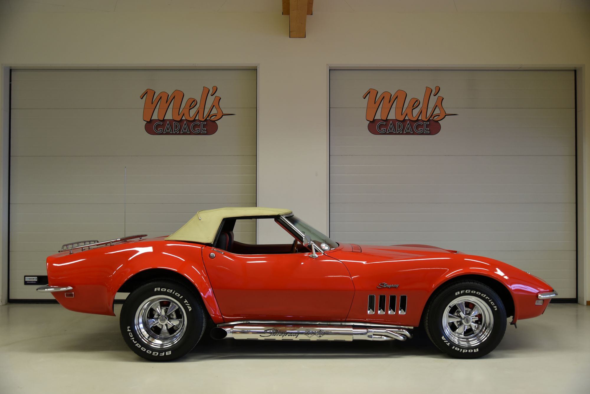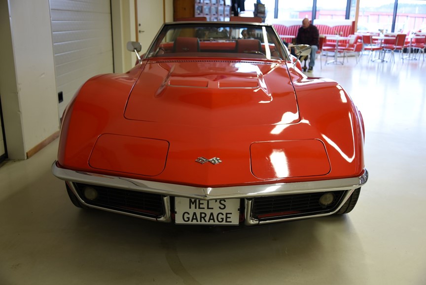 Chevrolet Corvette Cabriolet 1968. V8 zz4 350 motor som är strokad till 383 med aluminium toppar och ca 425hk motorn har gått ca 200 mil. TH 700 R4 automatlåda. Fina sidepipes som mullrar fint. Aluminium kylare med el fläktar. Original bakaxel. Styrservo. Nya slitsade bromsskivor fram och bak med servo. Lackerad för ett antal år sedan i denna klarröda kulör med ett fint resultat dock finns vissa små skavanker då bilen har använts. Dom breddade skärmarna bak är i bra skick så dom är gjorda bra. Kromet runt bilen är i ett mycket bra skick och bilen är även extra utrustad med ett Luggage Rack som även det är i fint skick. Inredningen går i röttsvart och är i ett fint skick rakt igenom med andra bekvämare stolar och special sydd klädsel i skinn. Instrumentbräda och dörrsidor är hela och fina som även gäller för resten av inredningen. Beige manuell vinyl cab med plastruta som är i ett riktigt fint skick. Cragar SS fälgar med spinners och 23560-15 fram och 29550-15 bak med ca 6mm mönsterdjup. En Corvette tillhör Amerikas klassiska muskelbilar och är alltid populära är det dessutom en cab som denna så står dom högt i kurs. Bilen känns tight och stabil på vägen med bra kraft från motorn i alla register. Besiktigad 2022-05-05 och nu besiktningsbefriad. Motor utbytt är inskrivet hos Transportstyrelsen.