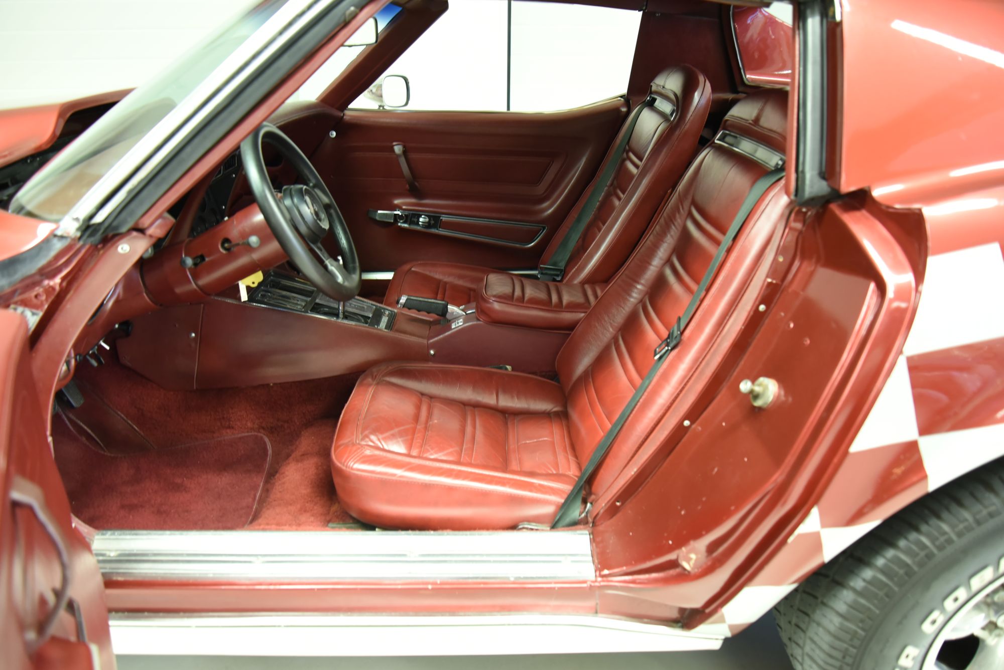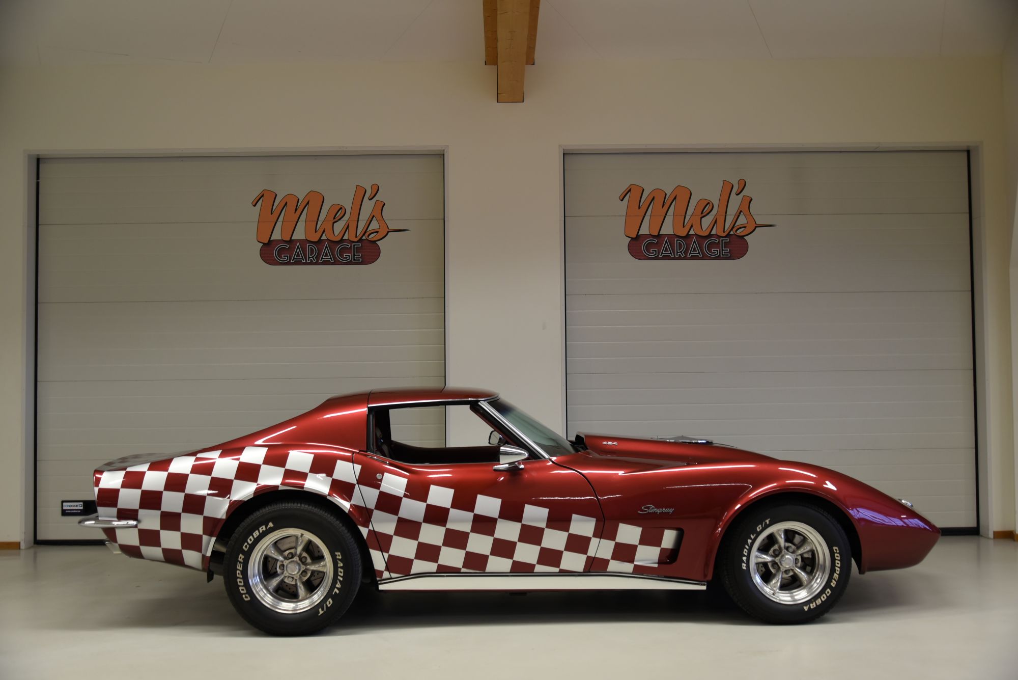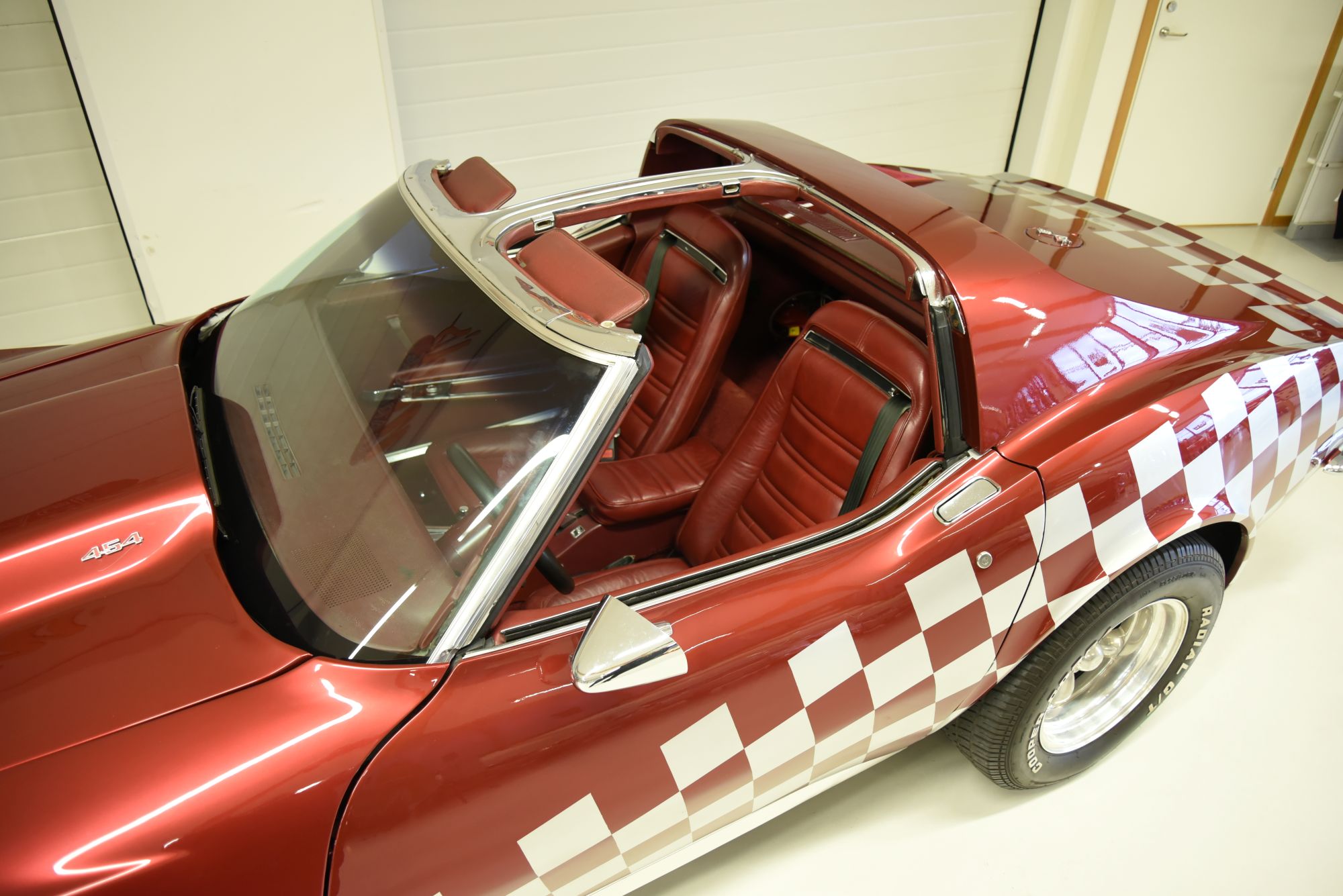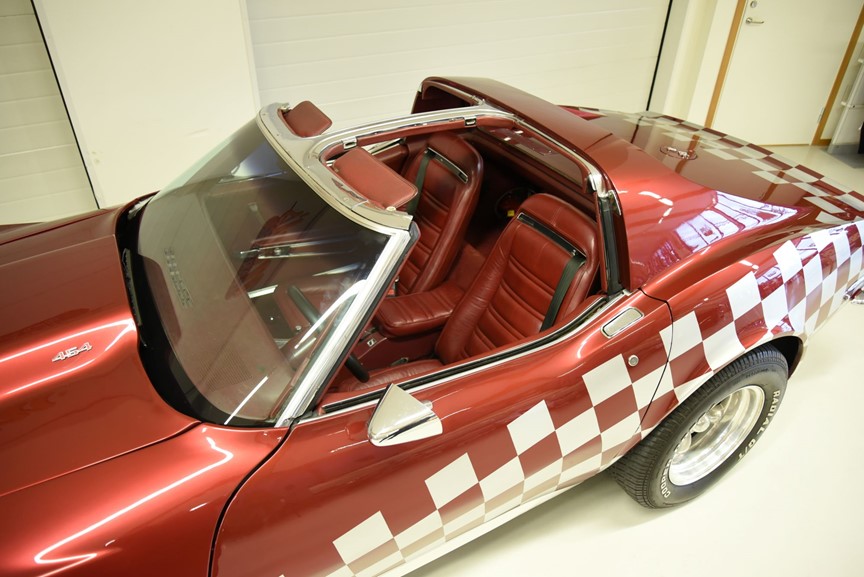 Chevrolet Corvette Stingray T-Top 1973. V8 454 smidd vevaxel smidda stakar smidda högkompression close-chamber kolvar. GM High preformance open chamber topplock som ger en körbar kompression på 10.5-1. Preppad TH400 automatlåda med utvidgad lamellsats. Diffad bakaxel med 3.431 utväxling. Finns mer att säga om drivlinan men den ger ca 520bhk. Finns även lustgas framdraget men aldrig körd med. Skivbromsar fram och bak med servo. Styrservo. Inredning i Burgundi i ett allmänt mycket bra skick. Bilen är omlackerad i röd candy på sivlerbas för ett antal år sedan och är fortfarande i ett härligt finns skick. American Racing fälgar med 23560-15 fram och 25560-15 bak med ca 5mm mönsterdjup. Det följer med två nya bakdäck och det kan behövas med denna motor. En riktig karamell som sticker ut i det mesta och är i ett allmänt fint skick. Känns tight på vägen med en drivlina som fungerar utan anmärkning. Så letar ni efter en Big Block Corvette så skall ni inte missa denna. Kan utlova en rejäl dos med körupplevelse och glädje.