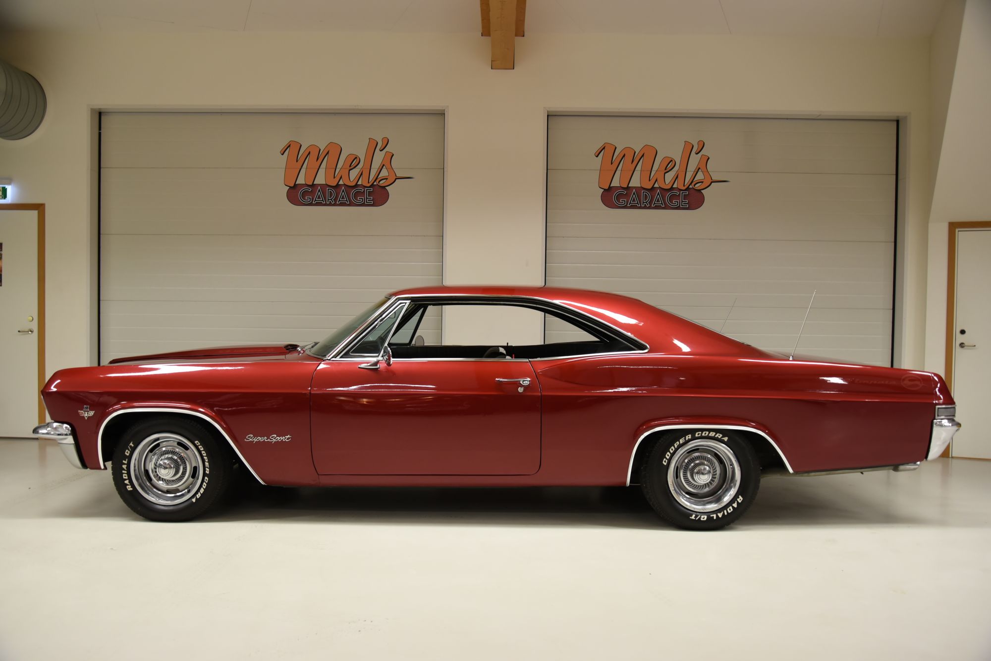 Chevrolet Impala SS 2-dr HT 1965. Bilen kom till Sverige 2019 och har haft samma ägare sedan dess. V8 350crate motor på ca 330hk köptes ny 2019. TH 700R4 automatlåda renoverad och genom gången av Jacky. 12 bultad bakaxel med Eaton diff och annan utväxling 3.431. Skivbromsar fram och bak med servo. Headders och dubbelt avgassystem som mullrar fint. Lackerad i en vinröd kulör med Impala SS in lackerat i bakskärmar och huv med ett mycket fint resultat. Inredning i svart skinn där allt är omklätt och är i ett härligt bra skick. Extra mätare för oljetryck vattentemp och laddning.