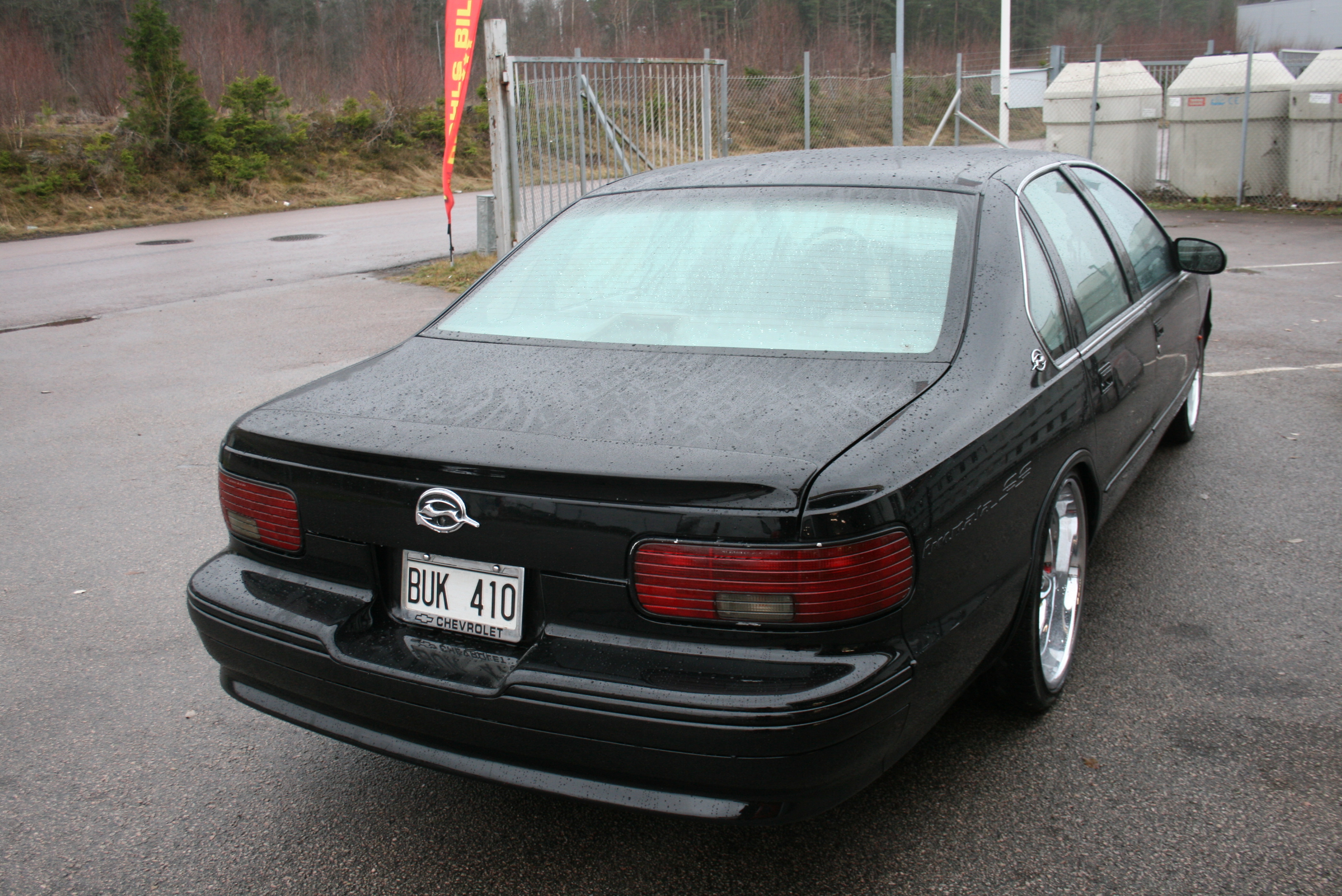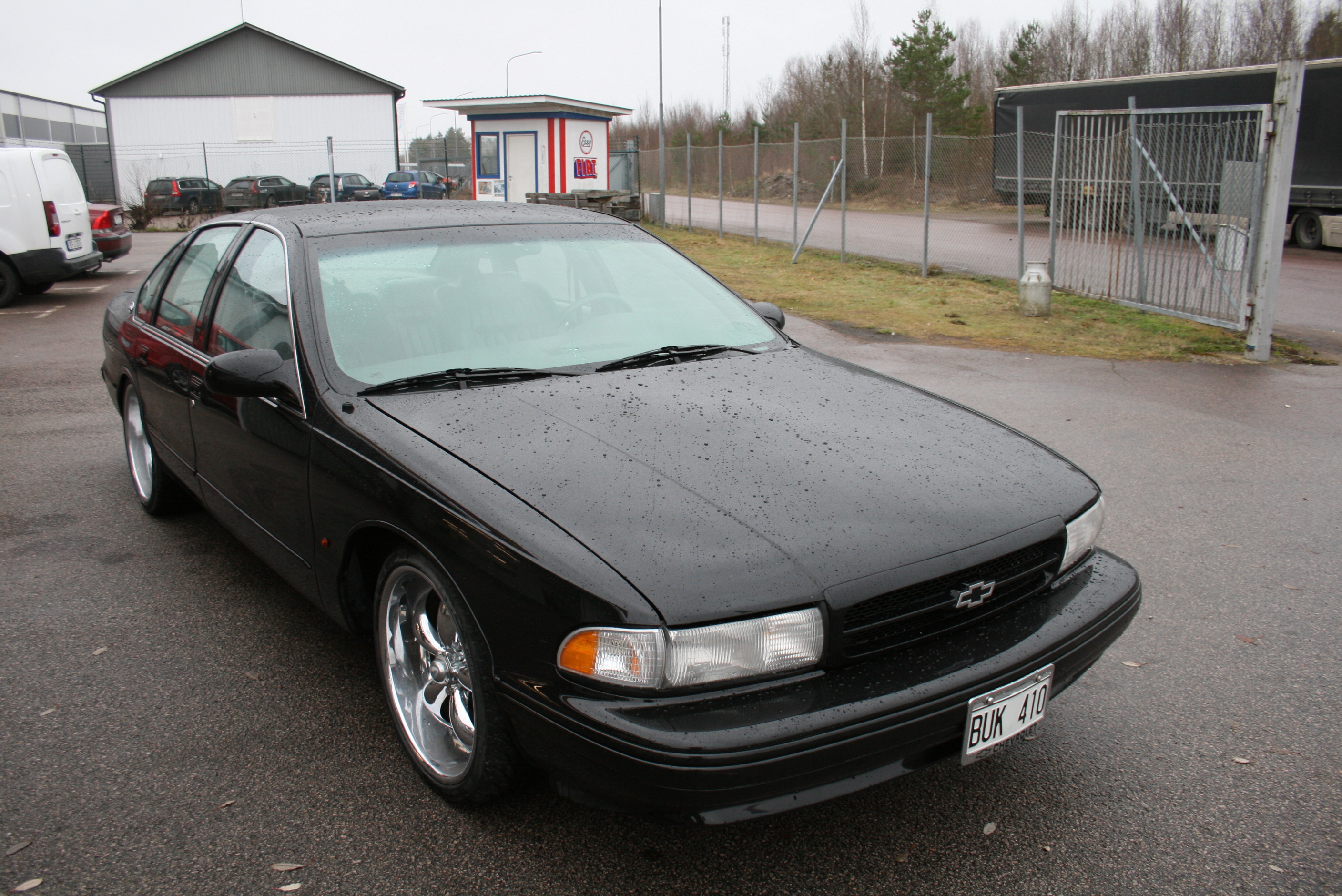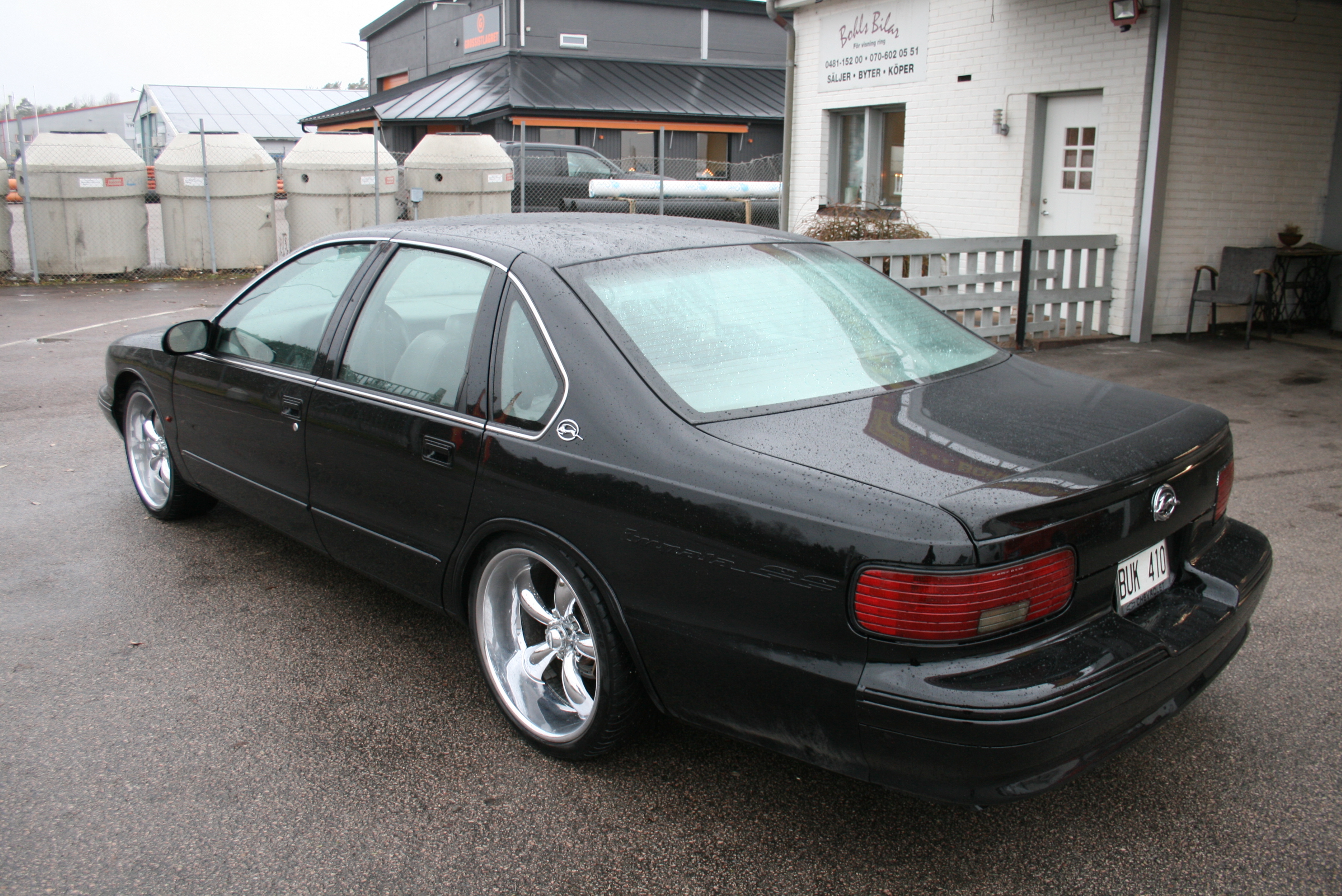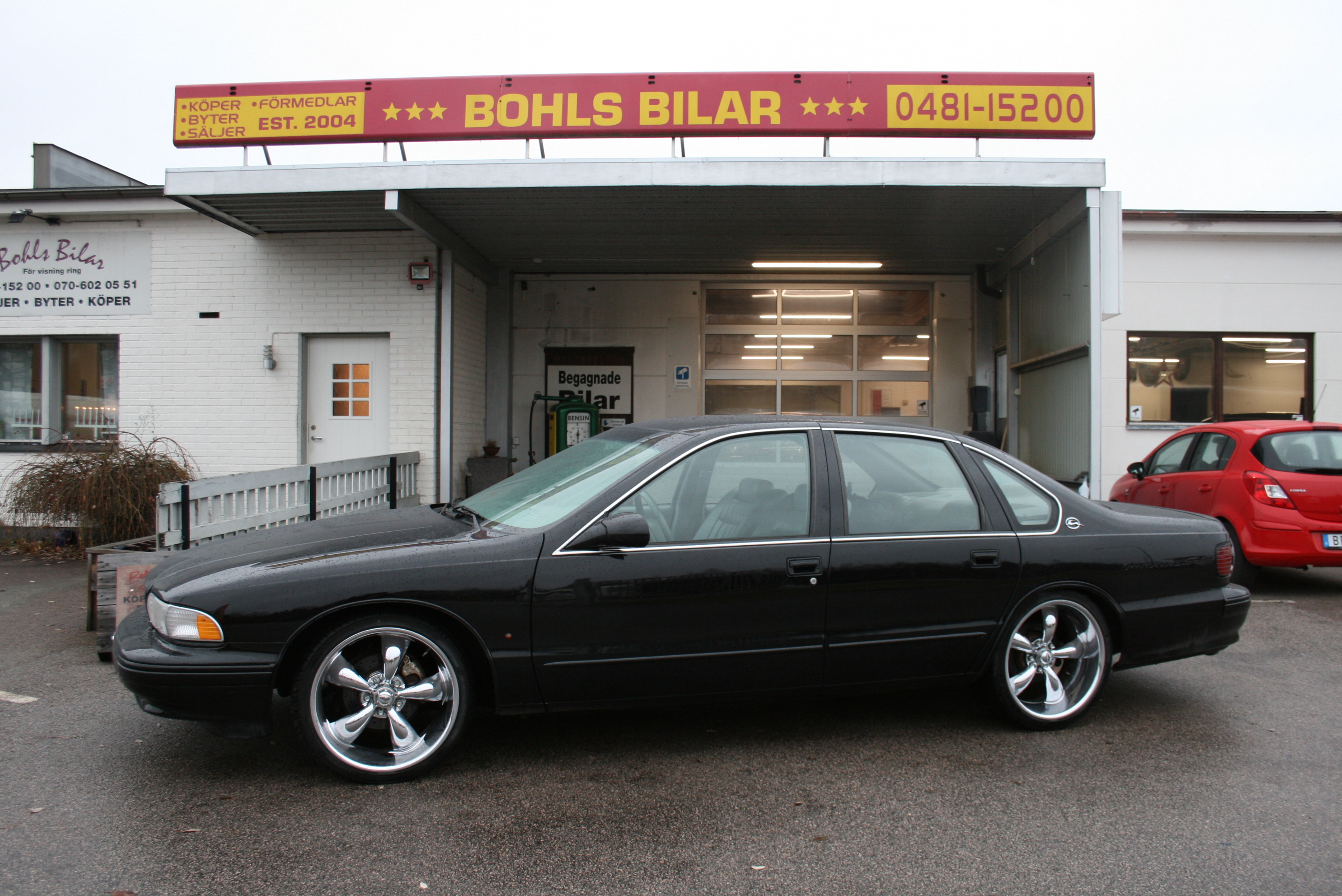 Chevrolet Impala Super Sport 1995 årsmodell i ett gott skick, rullar nu på riktigt fläskiga 20 tums Coys Chrome Wheels men original fälgarna finns givetvis kvar, näst sista årsmodellen utav den sista riktiga muskelbilen med ram och bakhjulsdrift GM byggde i Arlington Texas, totalt producerades 21 434 st bilar detta år, 350 LT1 V8 på 280 HK med automatlåda 4L60E som går fint, mullrar gott ur de dubbla piporna, har gott om kraft och körs dessutom väldigt billigt, utvändigt en svart solid lackering, grå skinn inredning med den broderade SS-loggan på nackstöden, lite hårdare stötdämpare och fjädring än syskonet Caprice och delar många komponenter och drivlina från Corvetten, reklam skyltar och original dokumentation medföljer, Bohls Bilar AB Säljer Byter Köper och Förmedlar din klassiker och USA-bil i Nybro sedan 2004, finansiering samt transportexport ordnas, följ oss på FB för senaste nytt samt fler bilder och videos på våra objekt, flera bilar i hallen och vi ser helst att man kontaktar oss innan besök för att säkerställa att bilen finns kvar och vi är på plats, givetvis kan vi ordna visning utanför kontorstider när det passar dig, Välkomna önskar Joakim med personal!
