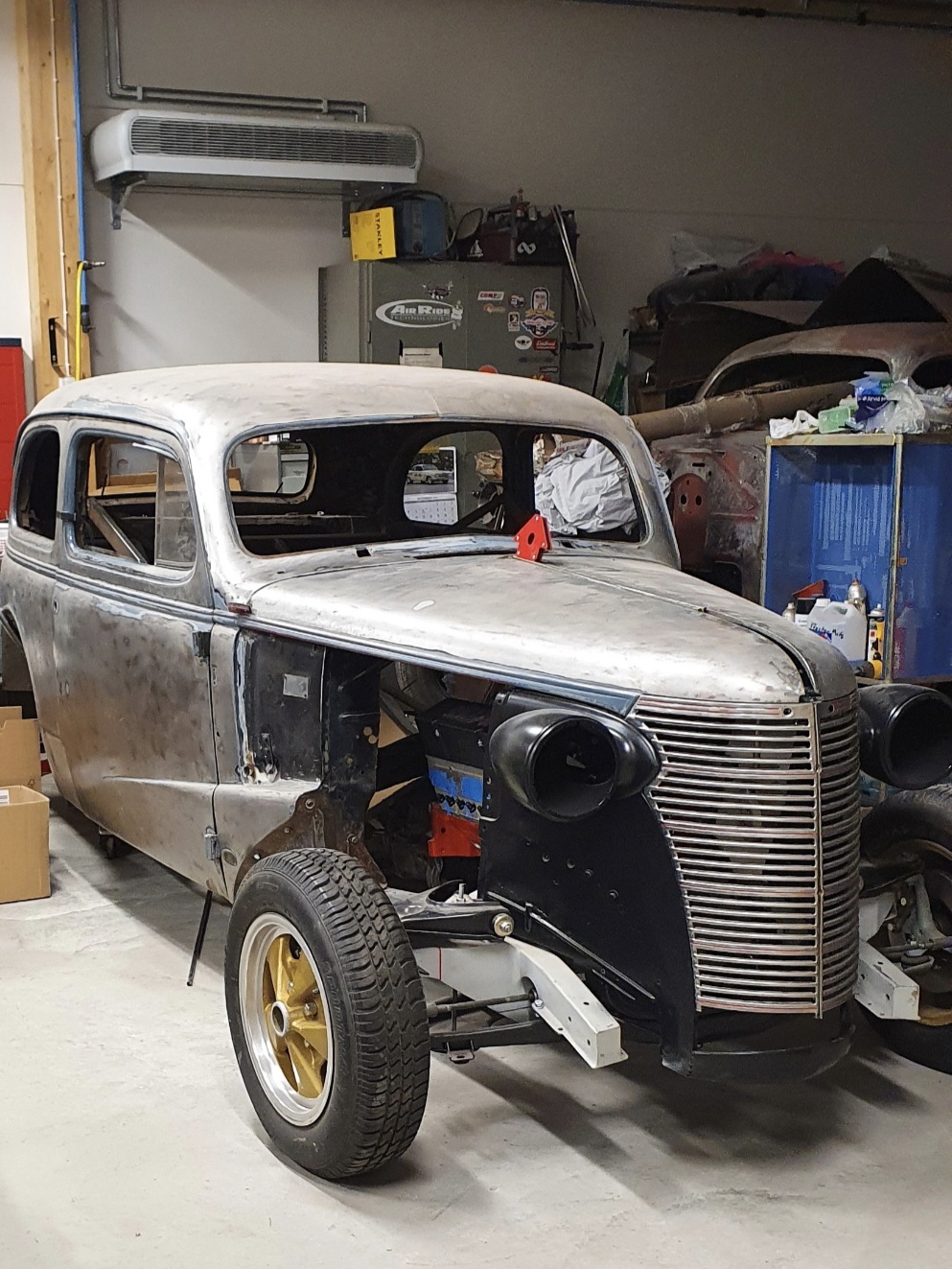 Barnfind Original 2 dr kaross i bra skick med ny brandvägg, nya golvplåtar ny tailpan, nya trösklar 2 sänkt över chassiet som är en X förstärkt originalram, med 2 indragna ramskenor med C notch med individuell framvagn med kuggstångsstyrning, QA1 dubbel justerbara coilovers, 11 skivbromsar, Ford 9 bakaxel som är kortad till 54 med HRW9 nodular hus 3,62 lager, Eaton truetrac diffbroms, 4,861 Richmond utväxling, Strange 35 splines drivaxlar, nya lager, Ford Racing 11 skivbromsar, upphängd i 4 bars wattslänk QA1 dubbeljusterbara coilovers.