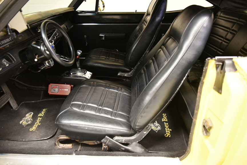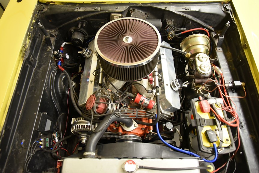 V8 440 ombyggd 2014 och strokad till 512cui. Aluminium toppar från edelbrock. MSD tändning. Edelbrock bränsleinsprutning. Holley tank med inbyggd EFI bränslepum. 727 3växlad automatlåda med manuellt ventilhus och reverserade lägen som är förstärkt. 3000rpm konverter sitter monterad nu i bilen och fungerar utmärkt. 8 ¾ bakaxel med Sure-Grip Posi diff och 4.11 i utväxling. Bromsskivor fram och trummor bak med servo. Bilen blev omlackerad sent 90 tal i nuvarande kulör och den har sina skavanker men i sin helhet så skäms den inte för sig. Inredning i svart vinyl där det finns en del torrsprickor i instrumentbrädan och ovansidan på ryggstödet bak men i övrigt riktigt trevlig. Modern stereo med AUX USB samt slutsteg i bagaget. Bälten finns på alla platser. Kromet runt bilen håller ett bra bruksskick. Center Line fälgar med 22560-15 fram 25560-15 bak med ca 4 fram och 7mm bak i mönsterdjup. Framdäcken är något snedslitna så en framvagnsjustering kanske behövs. En riktigt härlig Coronet 440 i ett allmänt fint bruksskick som sticker ut rejält med den gula lackeringen och det härlig ljudet från motorn. Så är du sugen på en muskelbil som du kan använda utan att vara super rädd om bilen så ska du titta lite extra på denna. Motor bytet är inskrivet hos Transportstyrelsen.