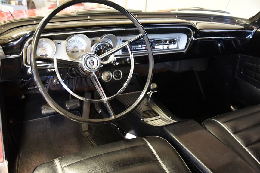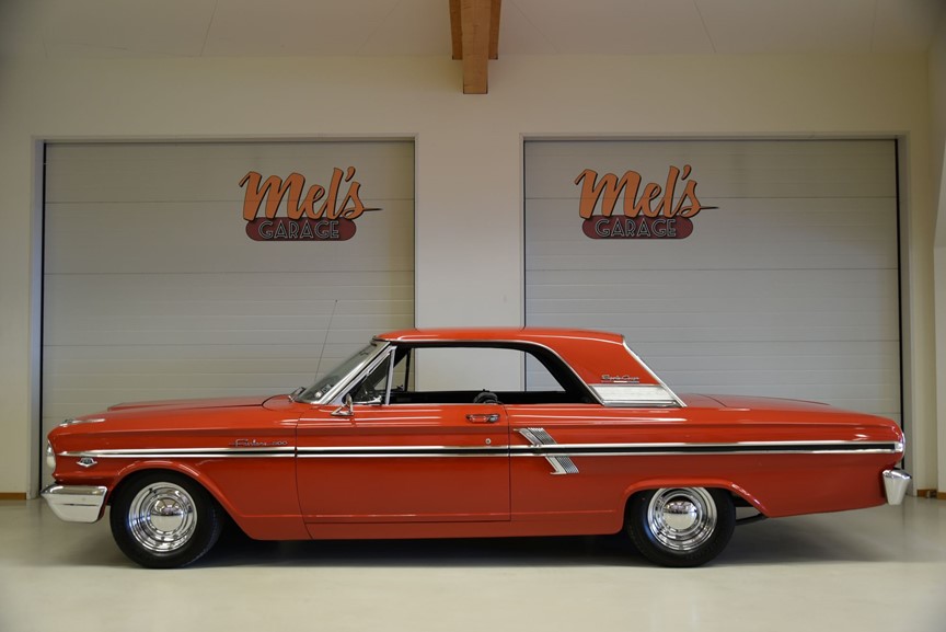 Ford Fairlane 500 Sport coupe 1964. En av ca 600 tillverkade med K-code motor = 289 4v Hi Power med ca 271hk. 4 växlad manuell växellåda med en riktigt skön koppling så man inte blir trött i benet. Original 9 bakaxel med diff. Bromsskivor fram och trummor bak utan servo men fungerar utmärkt. Dubbelt avgassystem med original grenrör. Bilen är omlackerad för många år sedan i original kulören Rangoon Red och är idag i ett härligt bra skick. Kromet runt bilen är i fint bruksskick. Inredningen i svart vinyl är iordninggjord även den för ett antal år sedan och är i ett riktigt fint skick rakt igenom. Vä dörrsida ser lite trist ut i nederkant. Kromade fälgar med kromade navkåpor typ Baby Moon med 22560-14 däck och ca 6mm mönsterdjup. Bilen är något sänkt men är i sitt nuvarande utförande riktigt skön åk bil som går fint i drivlina så som på vägen. Så passa på att införskaffa en av ca 600 av just denna modell med K-code i Vin numret.