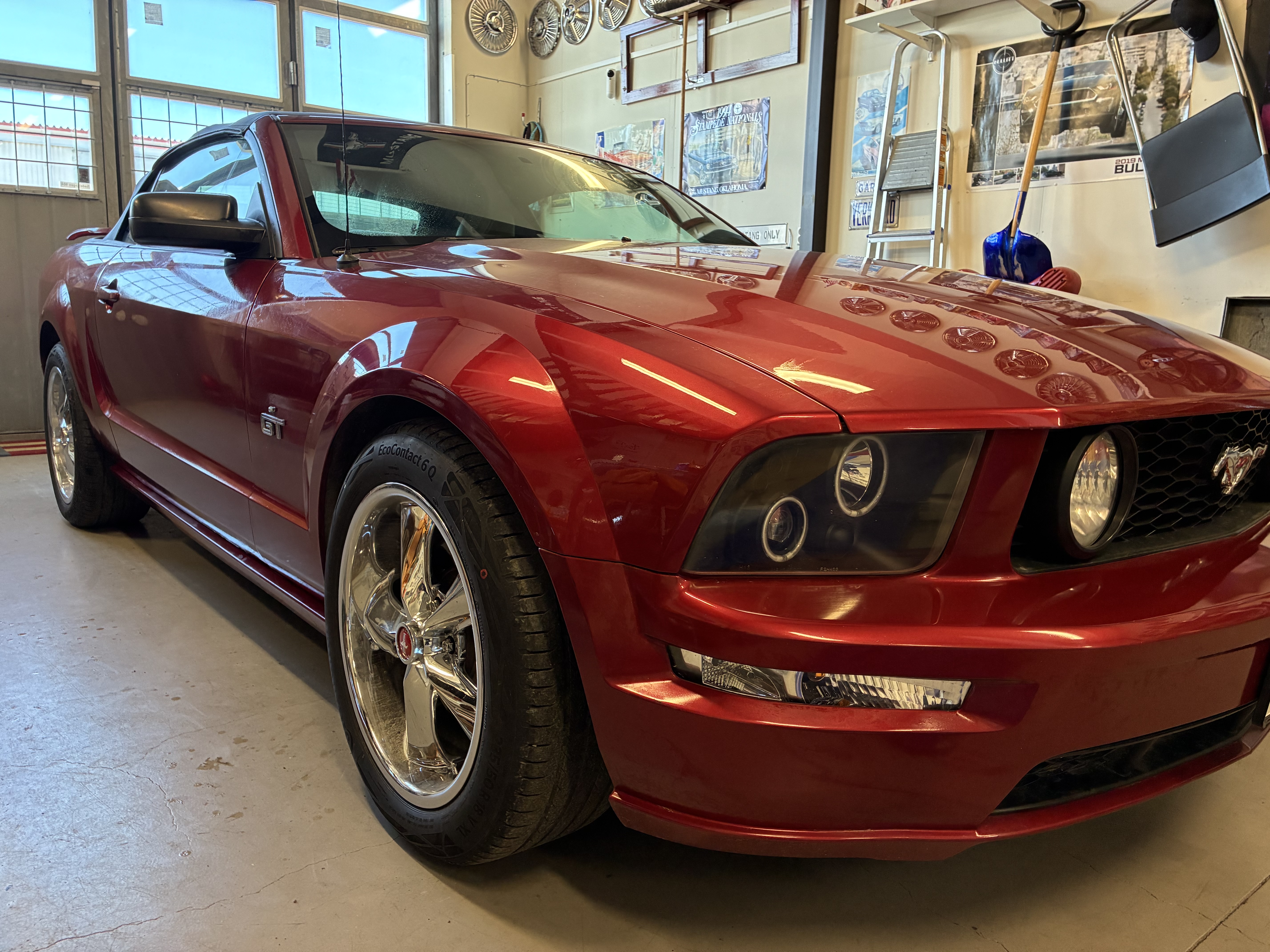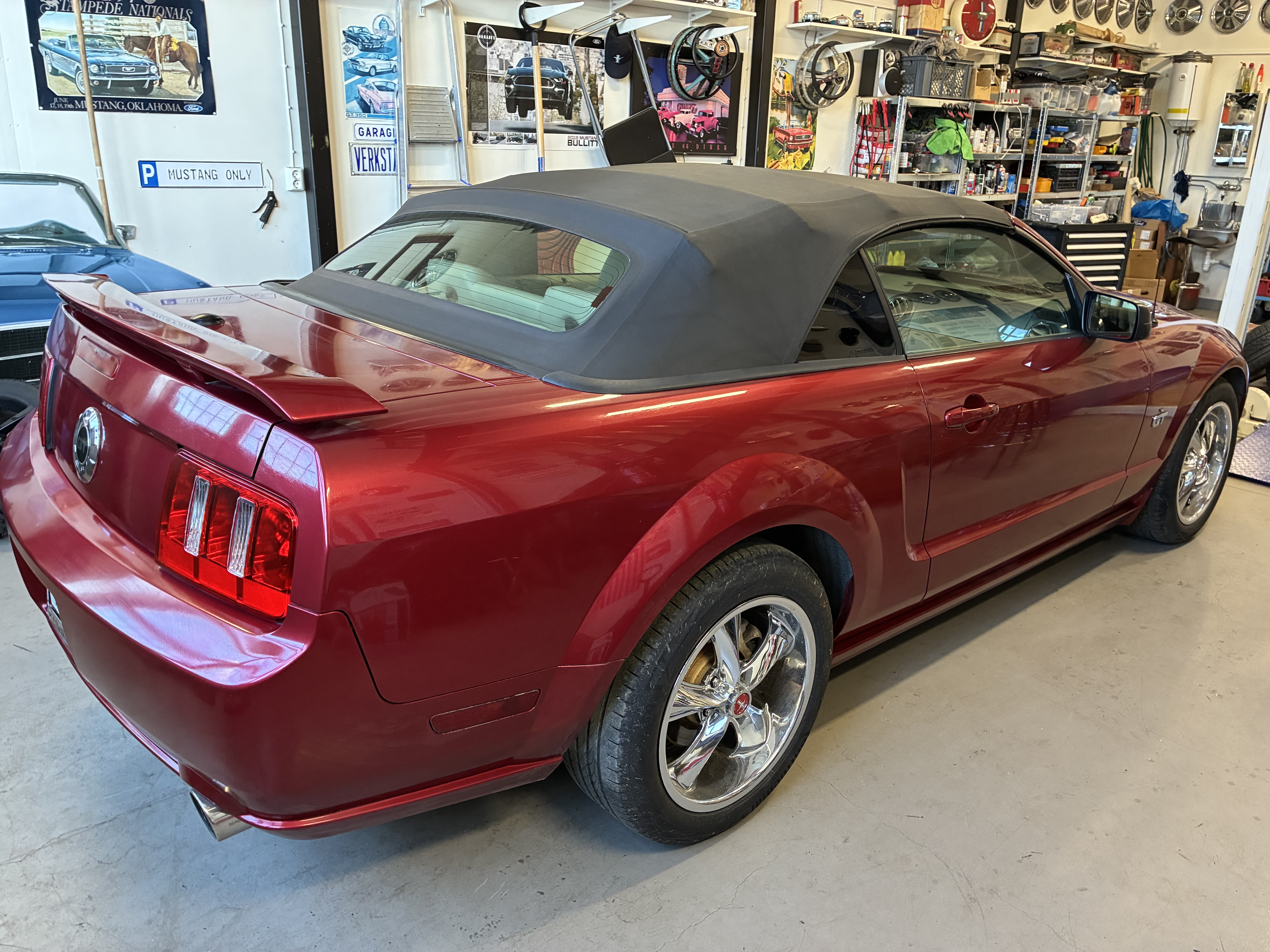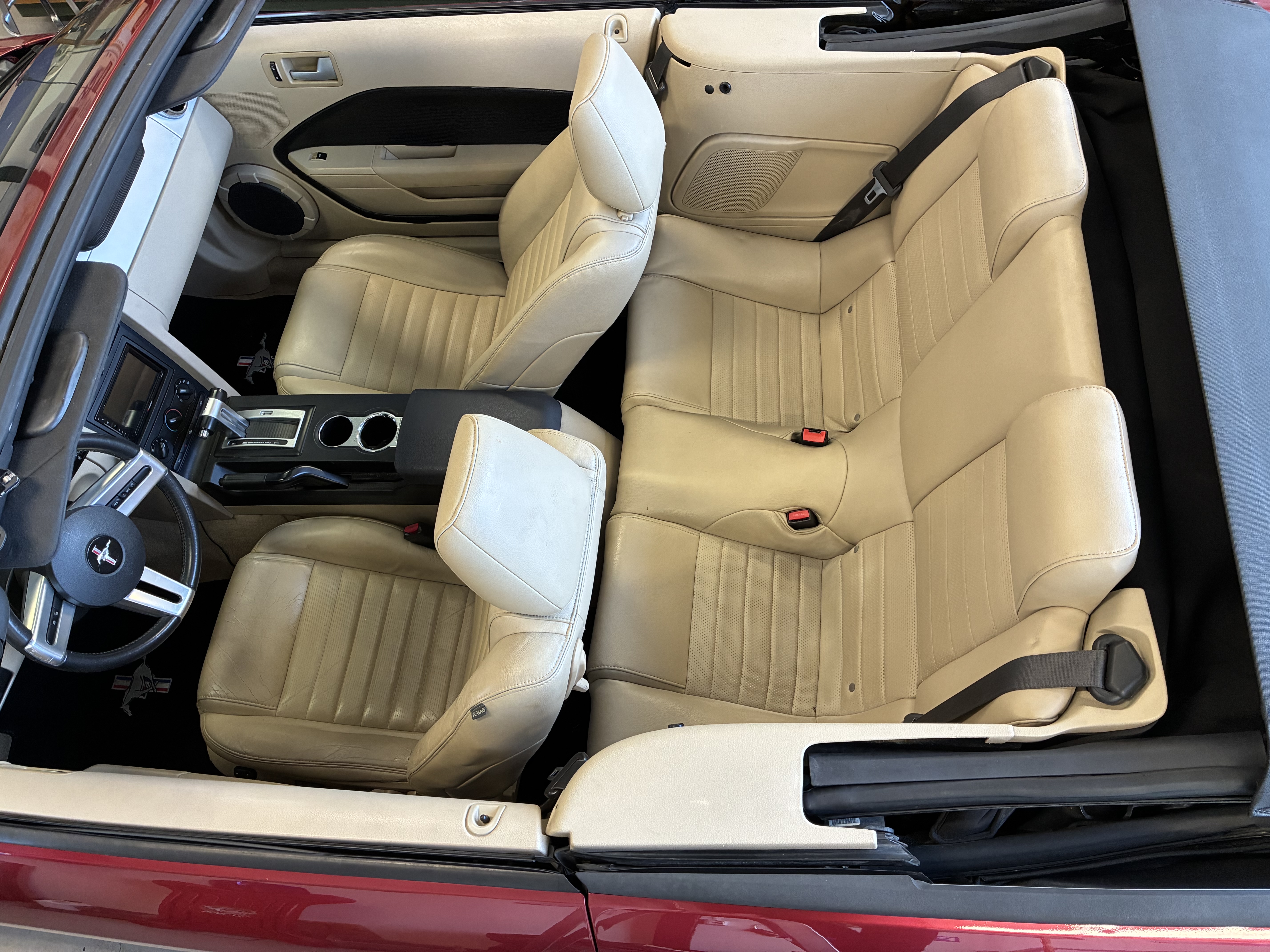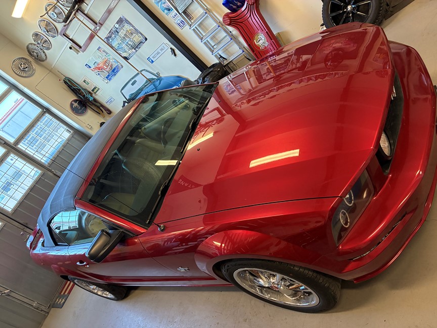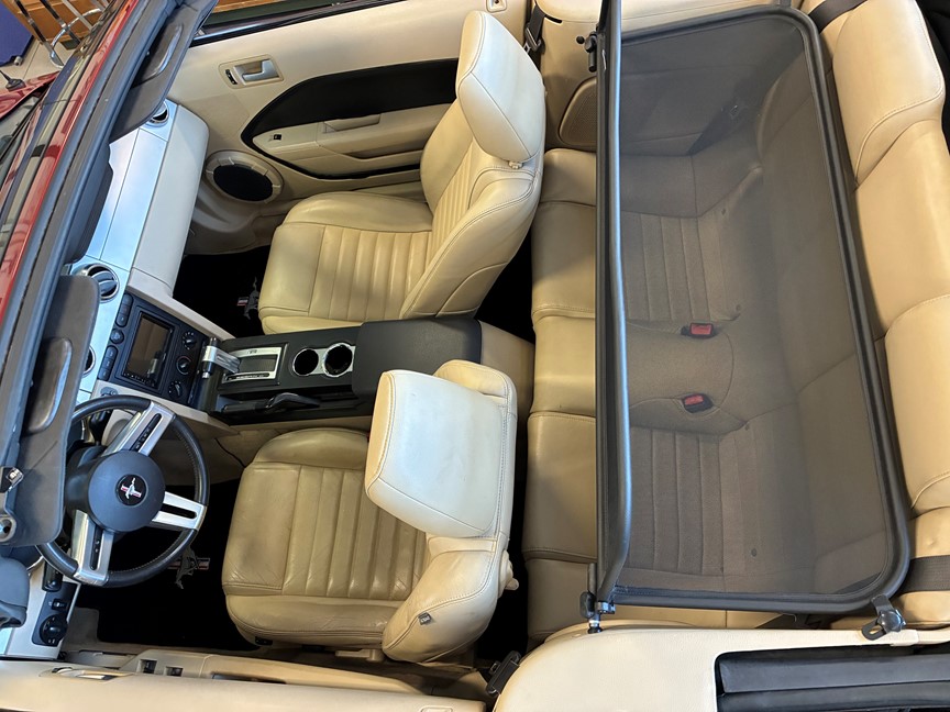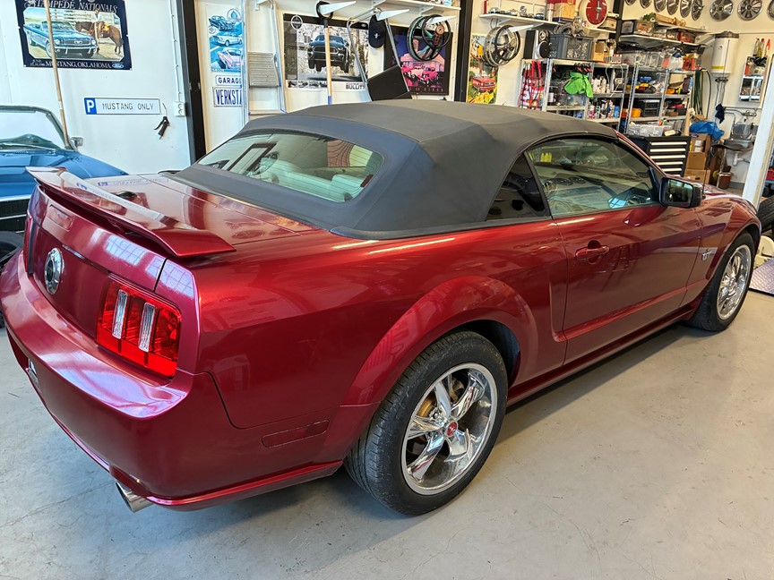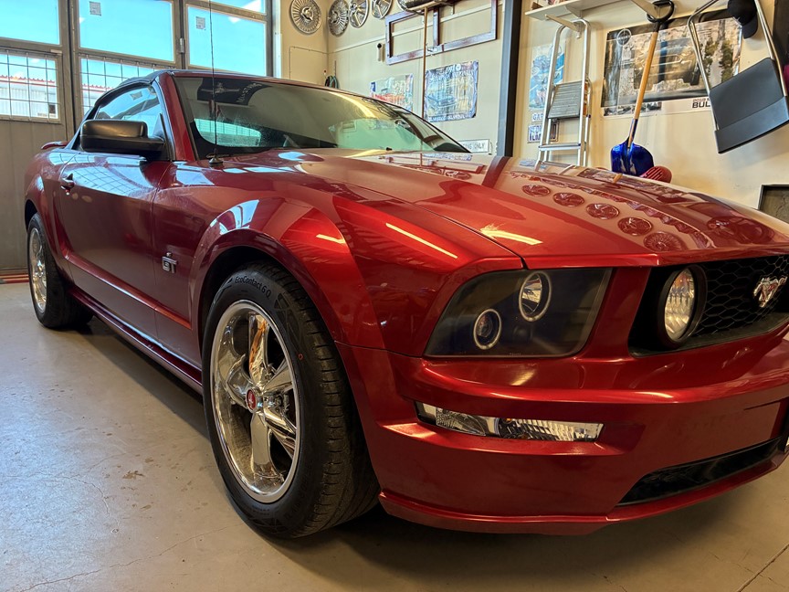 Fin GT Mustang i en härlig röd metallic, med en cremefärgad inredning. Nyare stereo med Bluetooth, Windblocker, nybes.