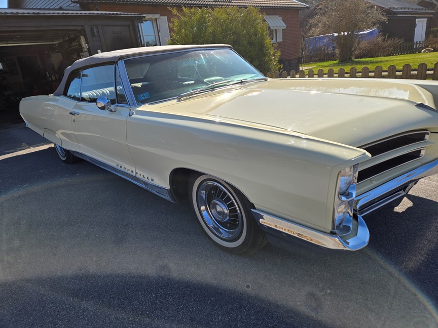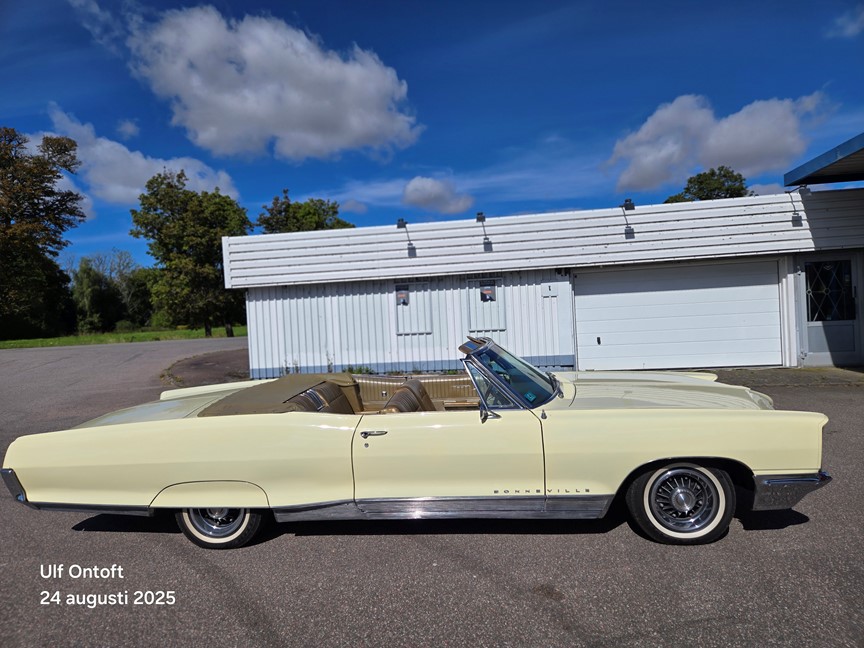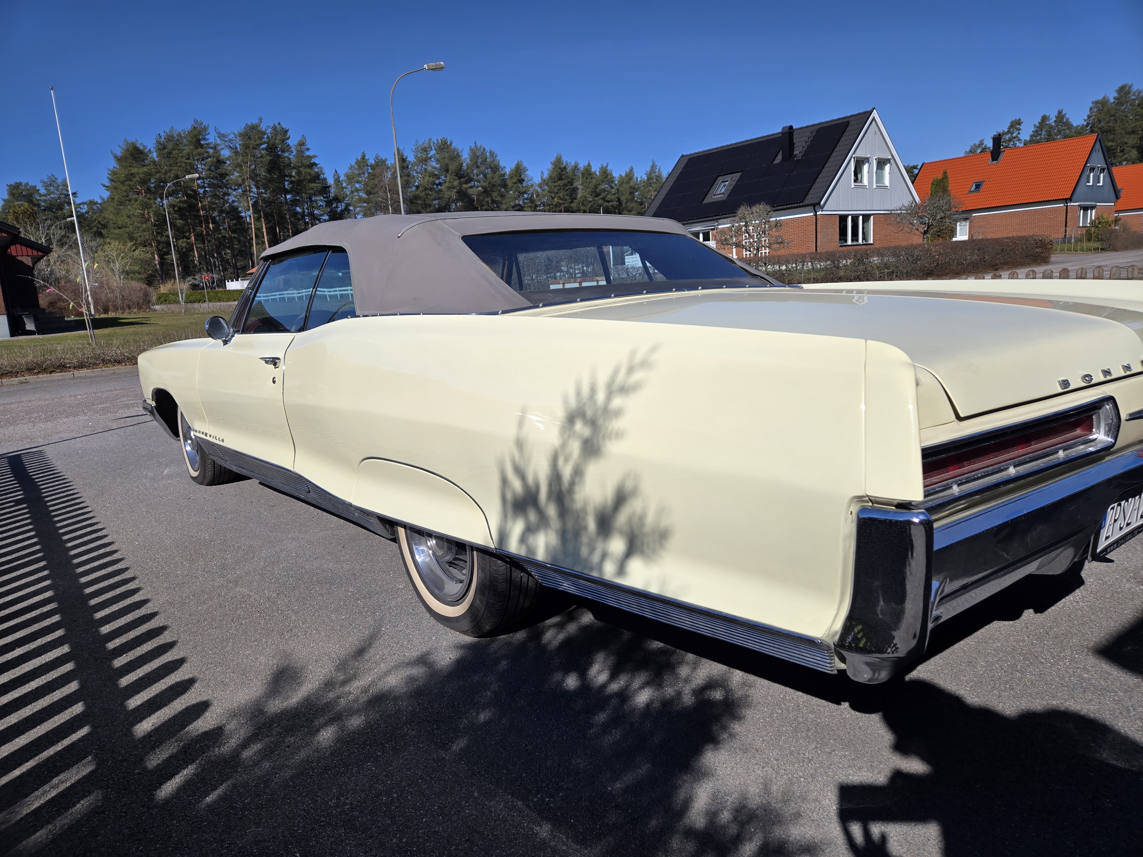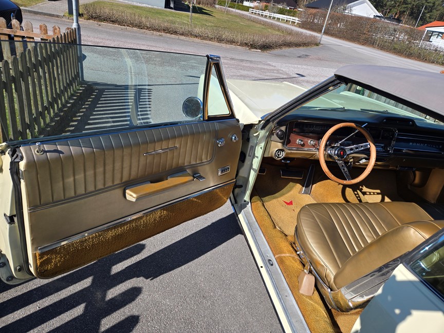 Pontiac Bonneville 1966 cab, i mitt tycke den vackraste av alla från mitten av sextiotalet, i den supersnygga kulören Candlelight Cream. Mycket bra bruksskick och med trevlig utrustning! Solid bil som fått sig en riktigt fin omlackering i originalkulören Candlelight Cream för många år sedan, inredning i Bronze som ser ut att vara helt original men är hel och i väldigt fint skick. Sliten originalratt medföljer. Gråbeige cab och cabskydd och jag samma kulör. Chrome, lister och emblem är även dem i mycket fint skick! Välutrustad med AC (ur funktion), Eight Lugs, elhissar och elsoffa med tveksam funktion ibland.