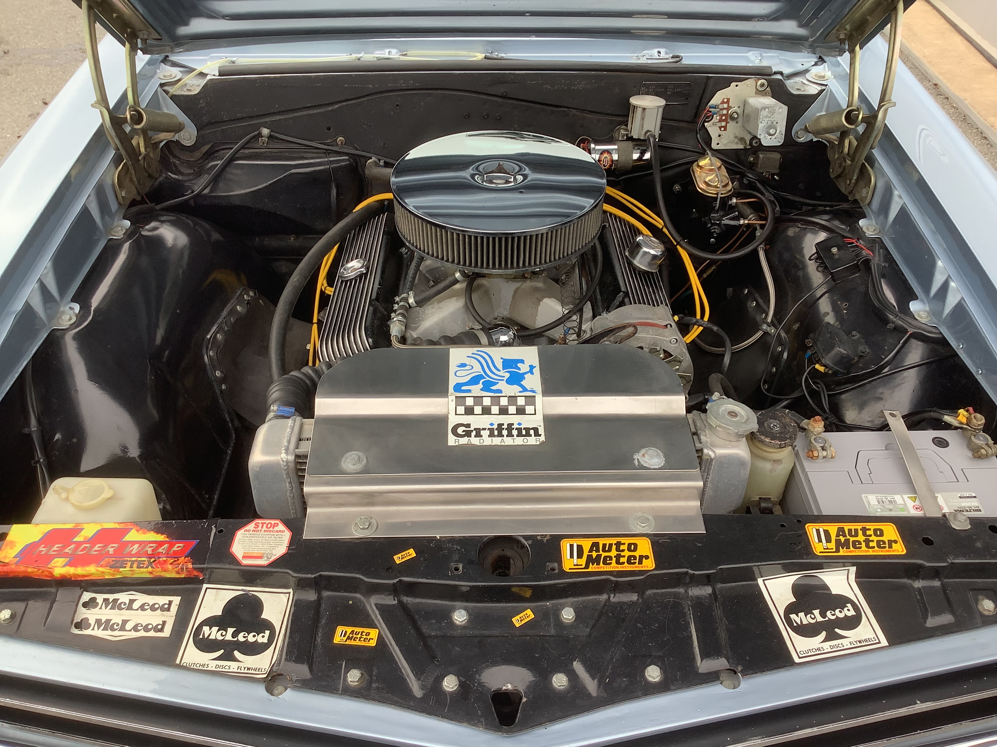 -Motor Pontiac 400 ram air som är blue printed med lite värre kam (Crane camshaft).