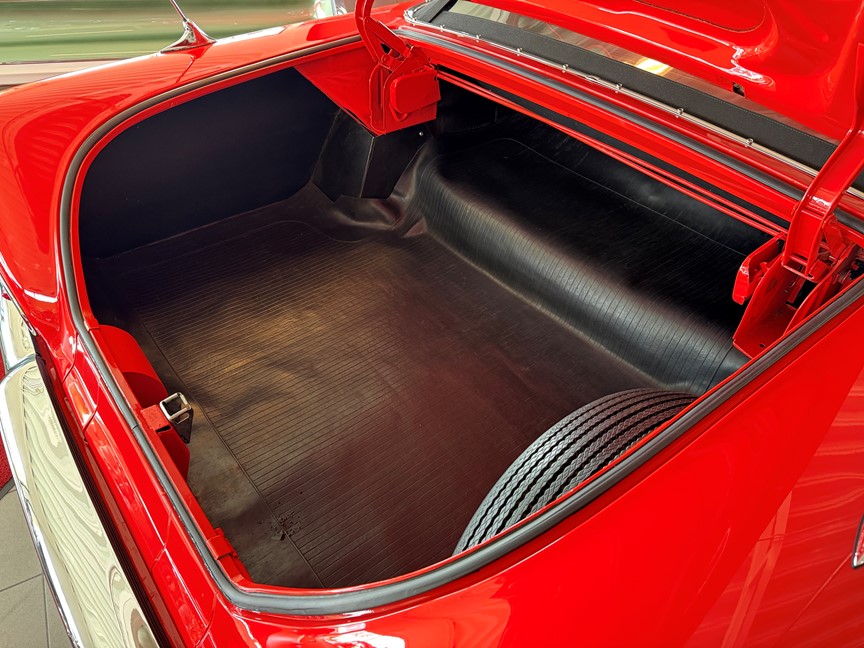 Snyggt rioröd med svart canvassufflett och därtill ett rött cabskydd. V8 283 700 automat. Servostyrning. Servobromsar. Skivbromsar. 2 kretssystem. 4 Elhissar. Spinnerskapslar. Dubbla antenner. Dubbla ytterspeglar. Dubbelt avgassystem. WhiteWalls däck. Avgasutsläpp. Servetthållare. Retrostereo. Tonade rutor. Huvisolering. Mm…