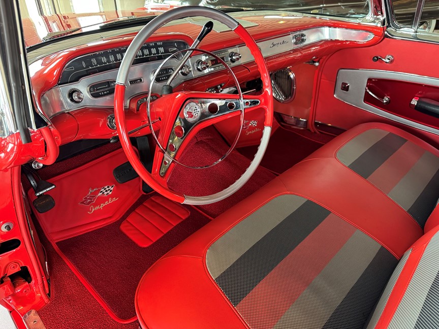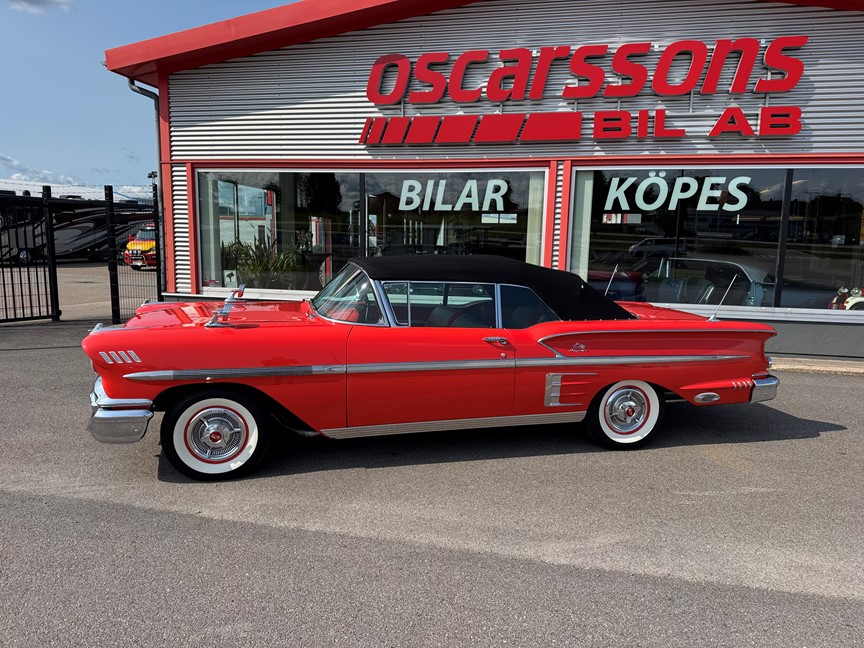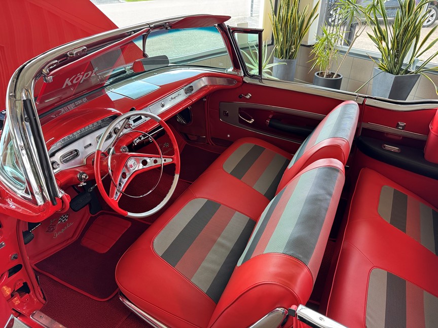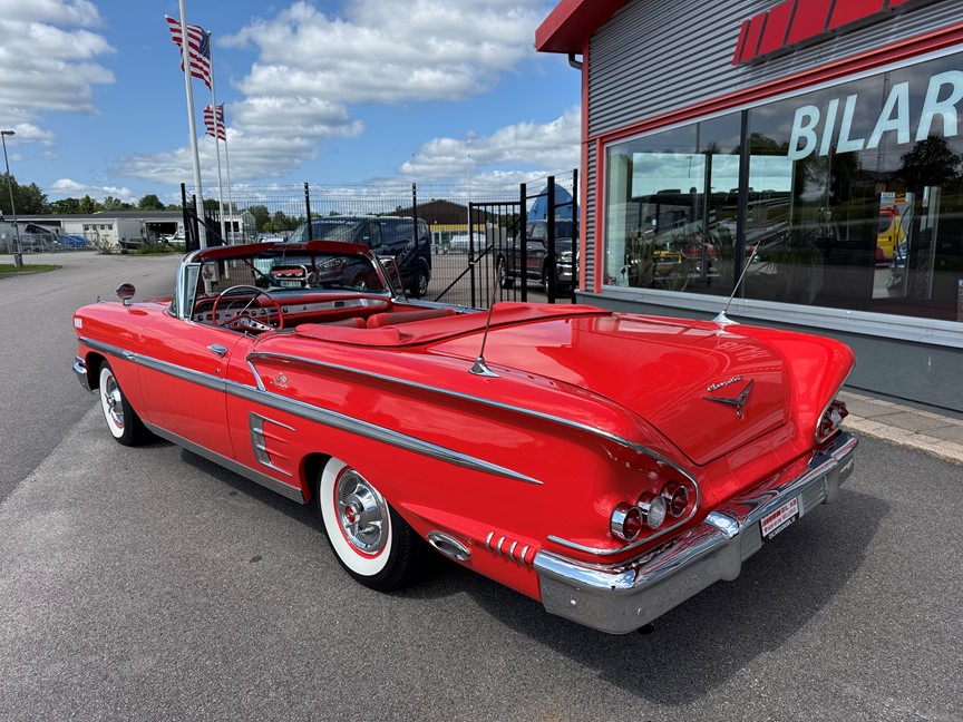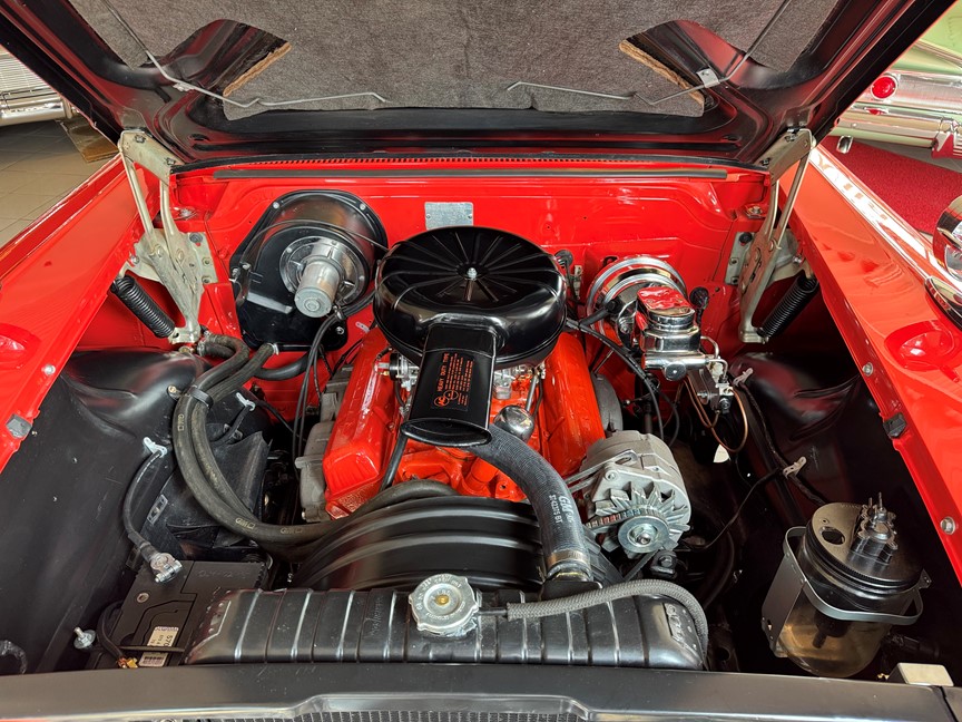 Mycket snygg och populär bil. som genomgått en riktig väl genomförd helrenovering i Sverige nyligen. Bilen är 1 av 4 Svensksålda Convertible och denna är även beställd i detta utförande färgval med 283 V8 (Code 1867). Rio röd (Code923) med rödsvart grå inredning (Code 855).