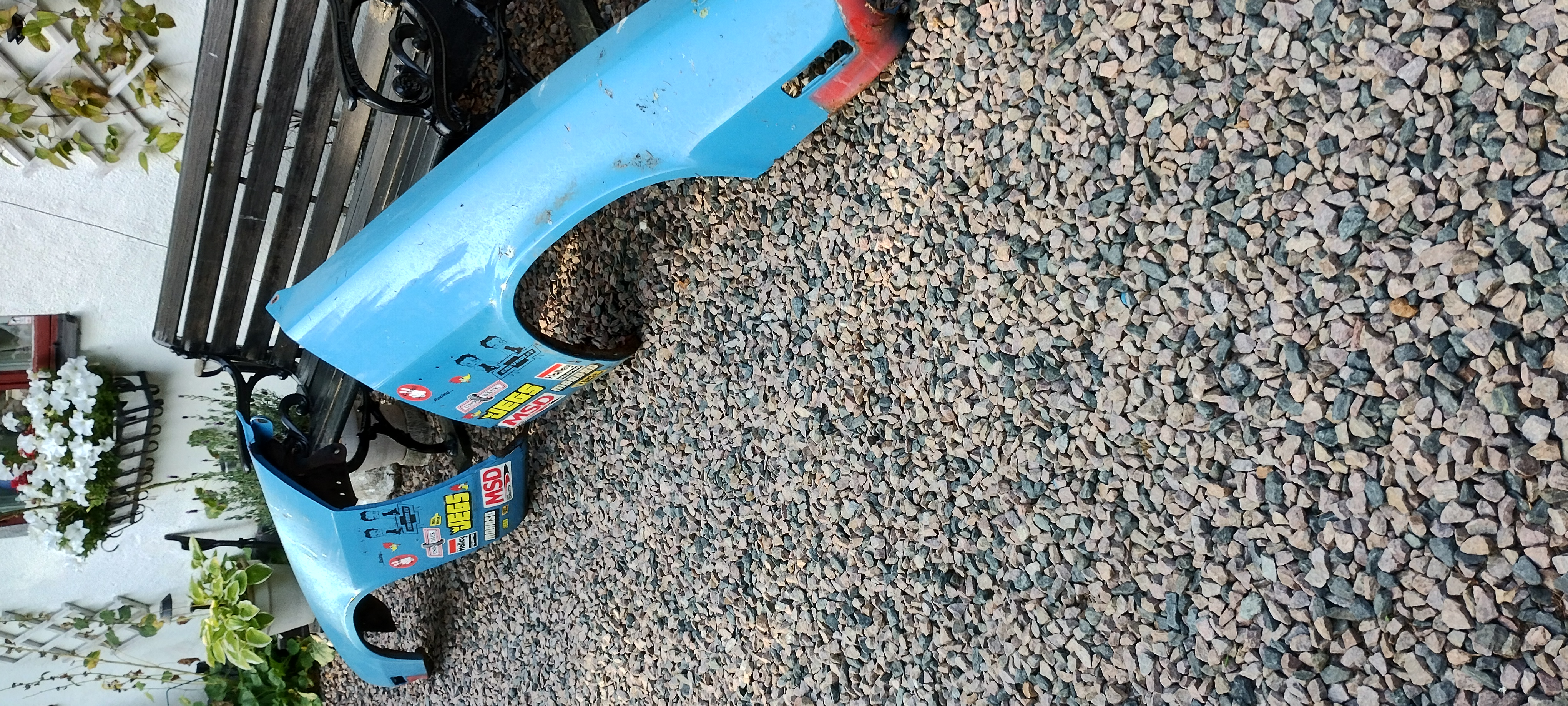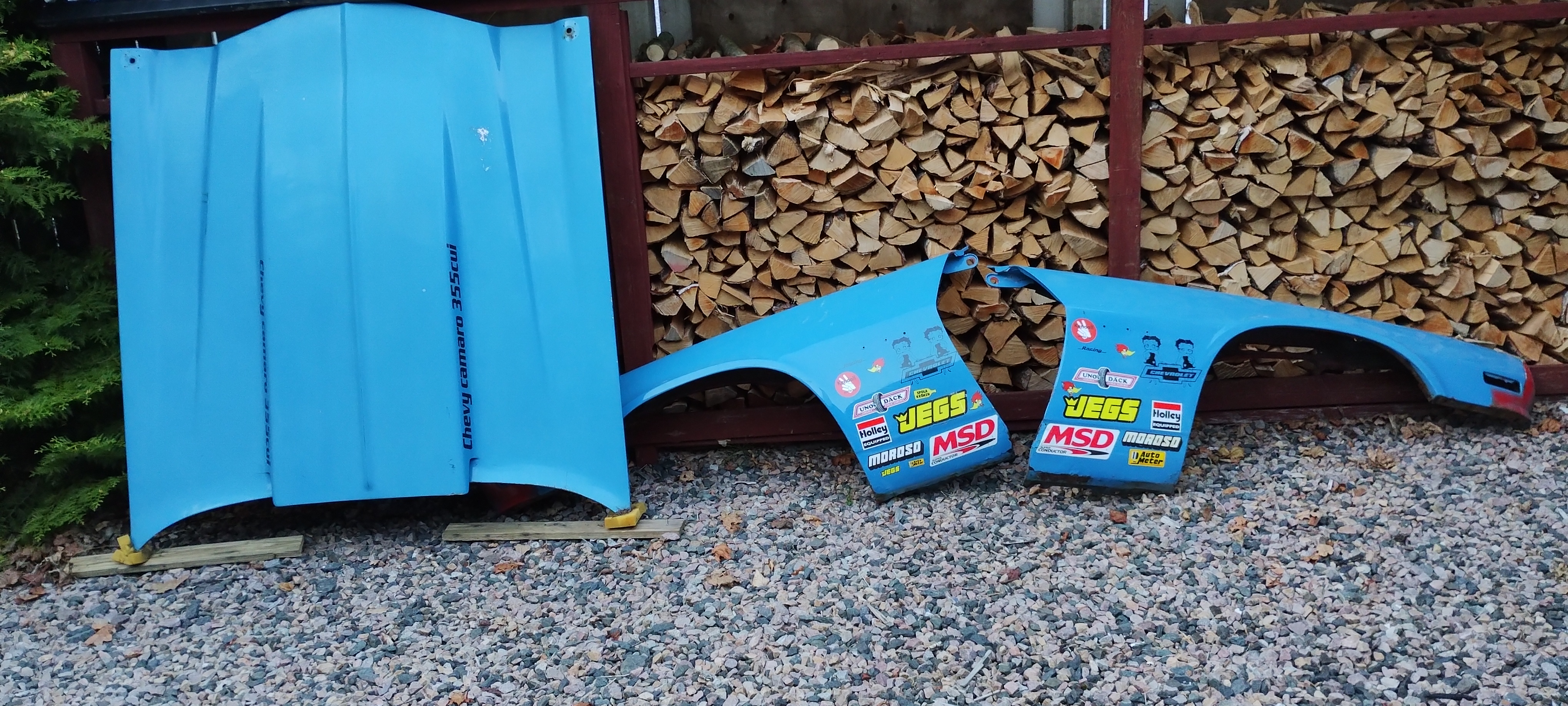Två framskärmar och en huv med scoop lite rost nederkant på skärmarna men annars raka och fina