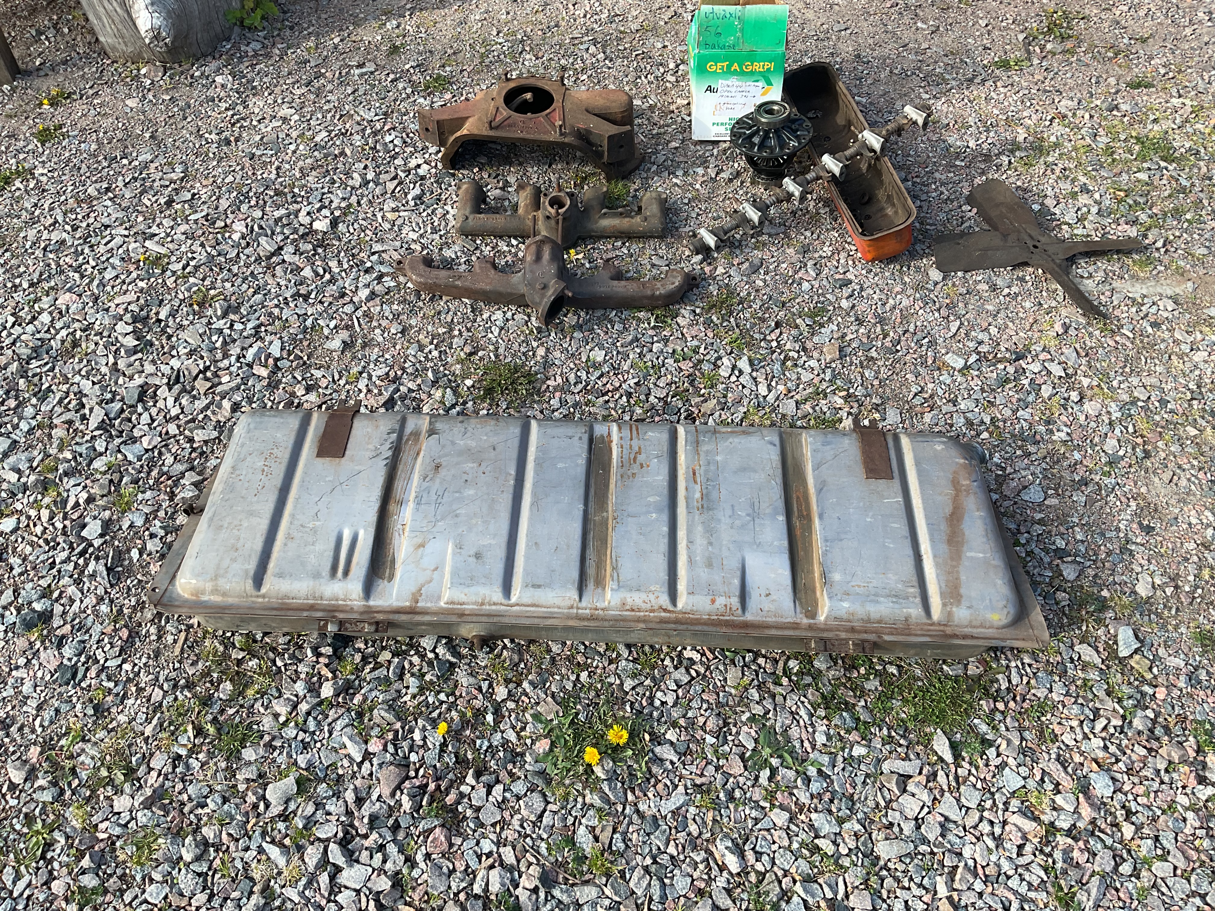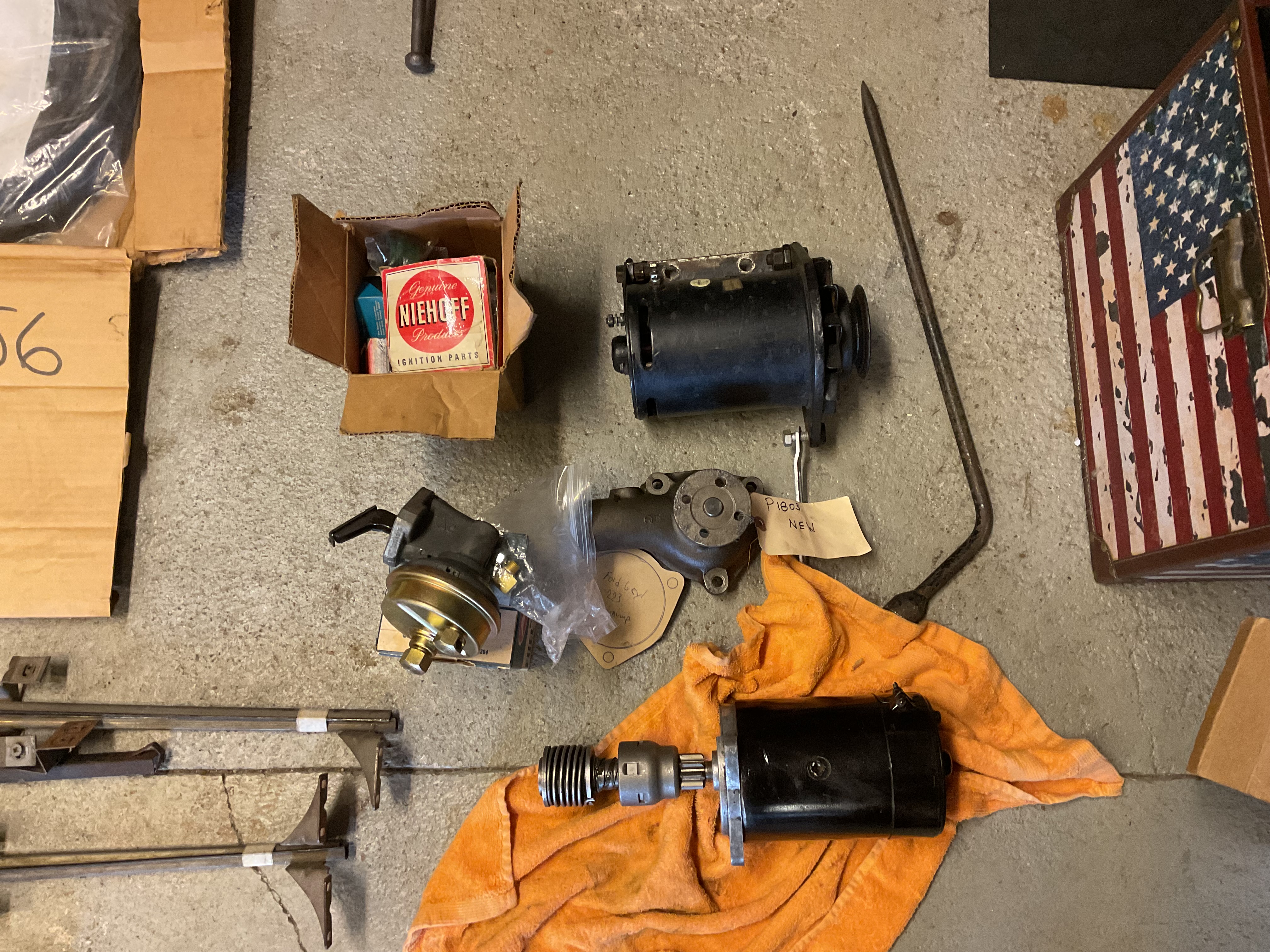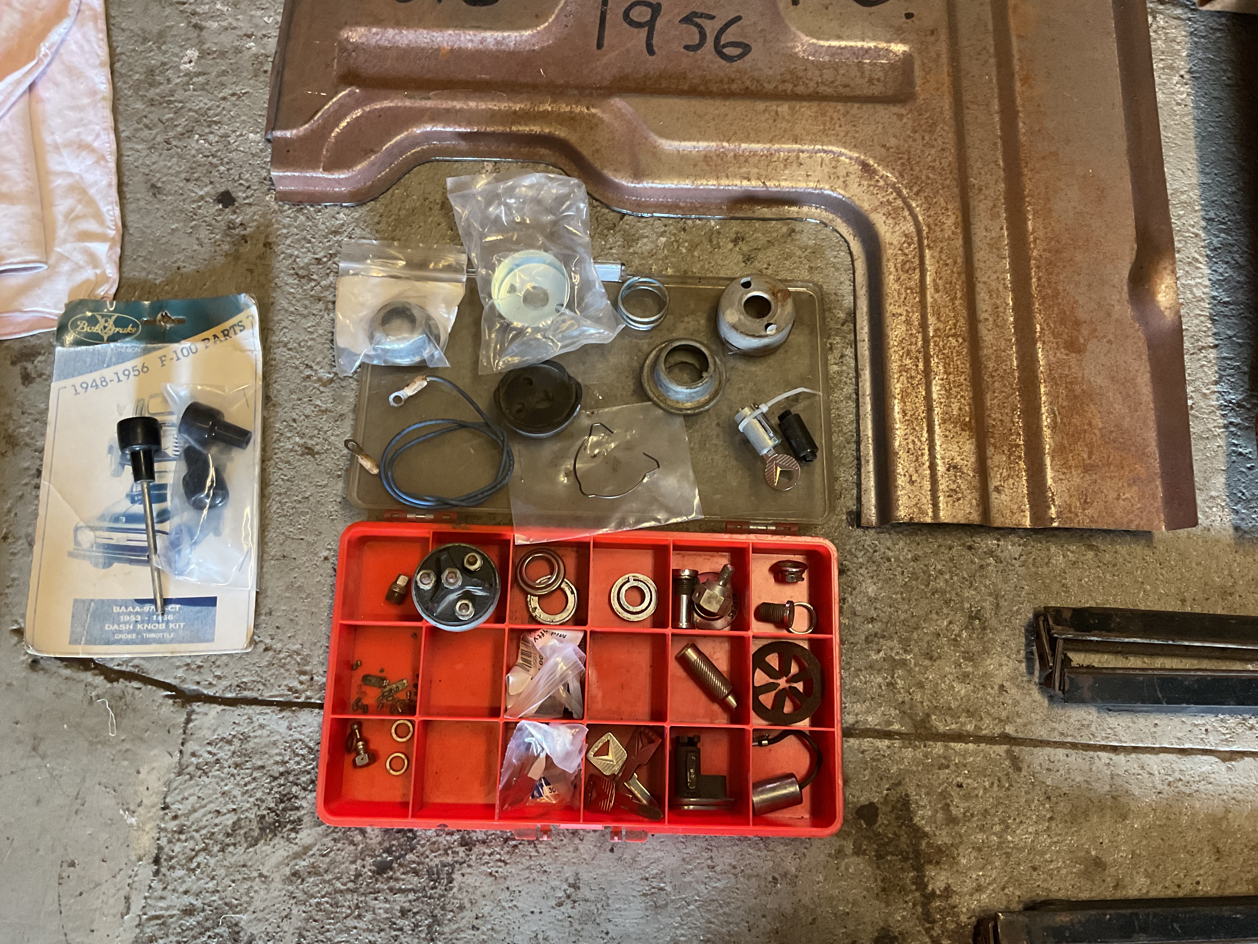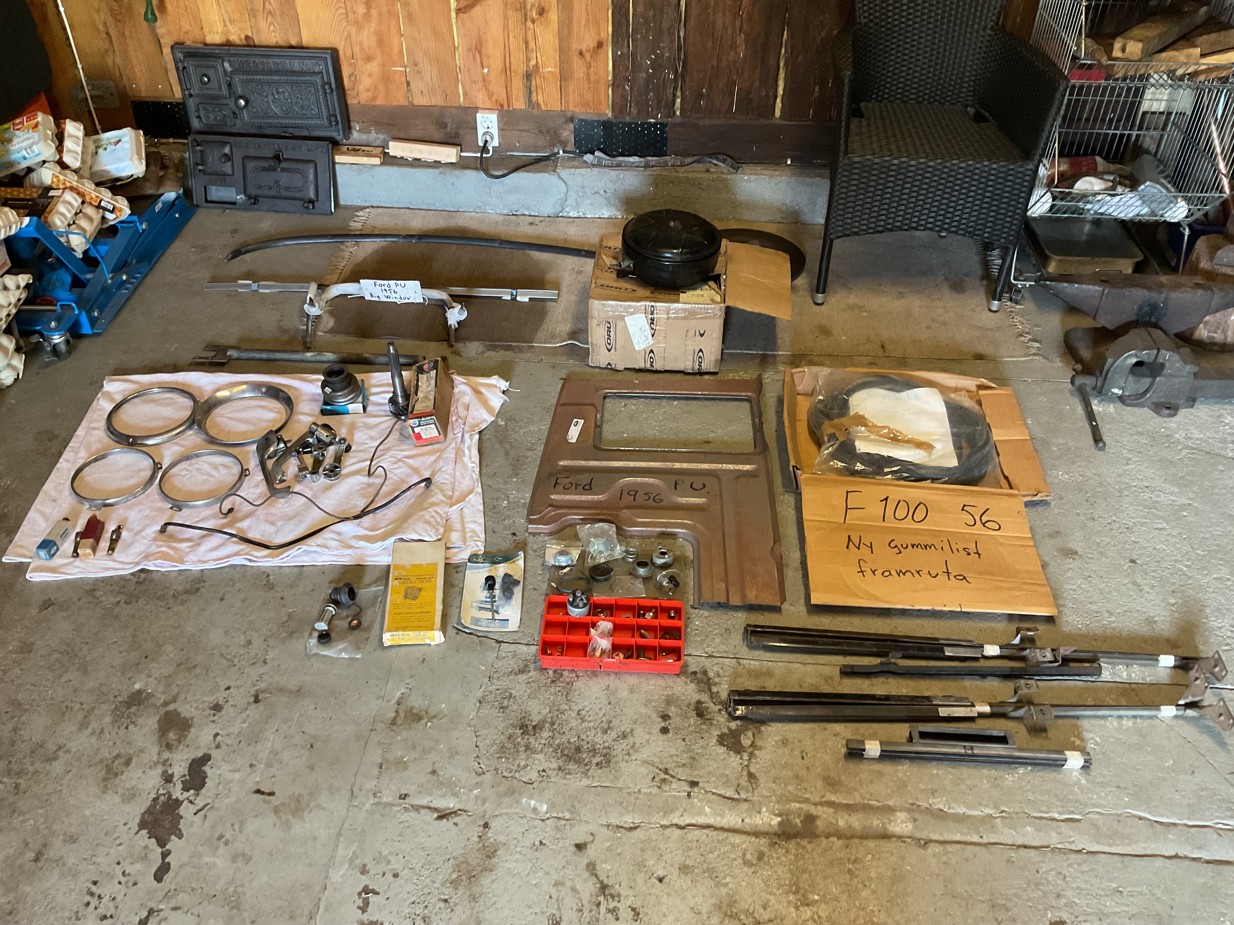 Garagestädning ford +ford pickup 1956 . Diverse delar passande både v8 och till 223 motorn till sexa allt finns förutom blocket ! . Beg och nors oanvända delar . Tanken i fint skick luftrenare +ingående axel v8 yblock nos. Delar till instrument + ratt det mesta ! Ny list framruta . Service kit 6a . Generator startmotor vatten pump m.m genomgånget renoverat . Fråga på säljer allt vid intresse . Obs har tex striker plates NOS till dörrar . Alla mätare istrument finns fina beg ! Alla relärer m.m syns ej på bild ! Trim till bakrutan big windov modellen ! Hemgjort mothåll till bakaxel ,när yoken ska tas bort ! Som sagt fråga på , bra priser ! Kjell