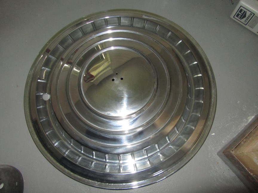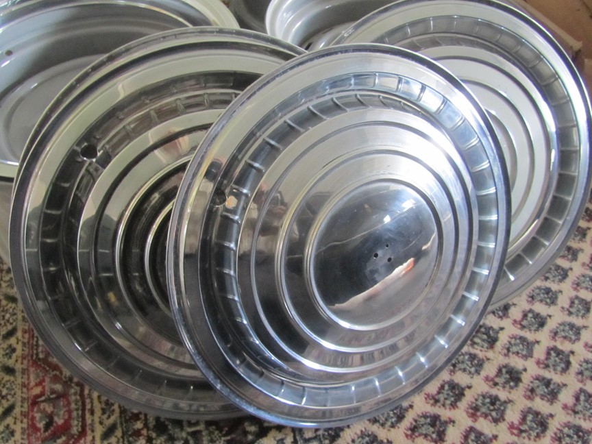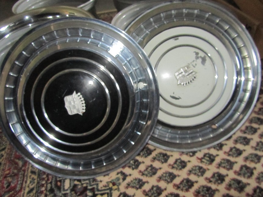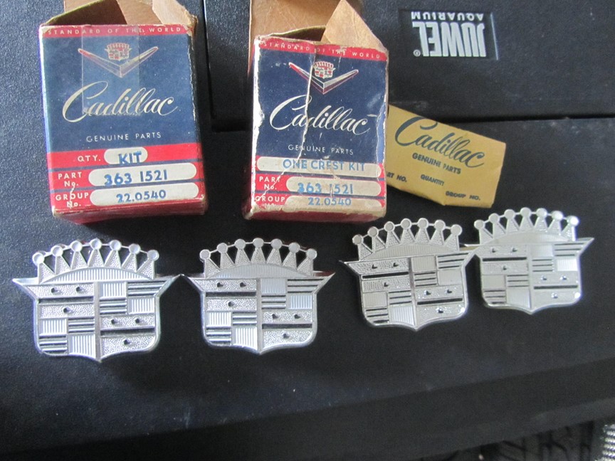 4 st. navkapslar till Cad.-60. Två NOS och två mycket fina beg. 4 st. NOS Emblem varav två i orig.ask.