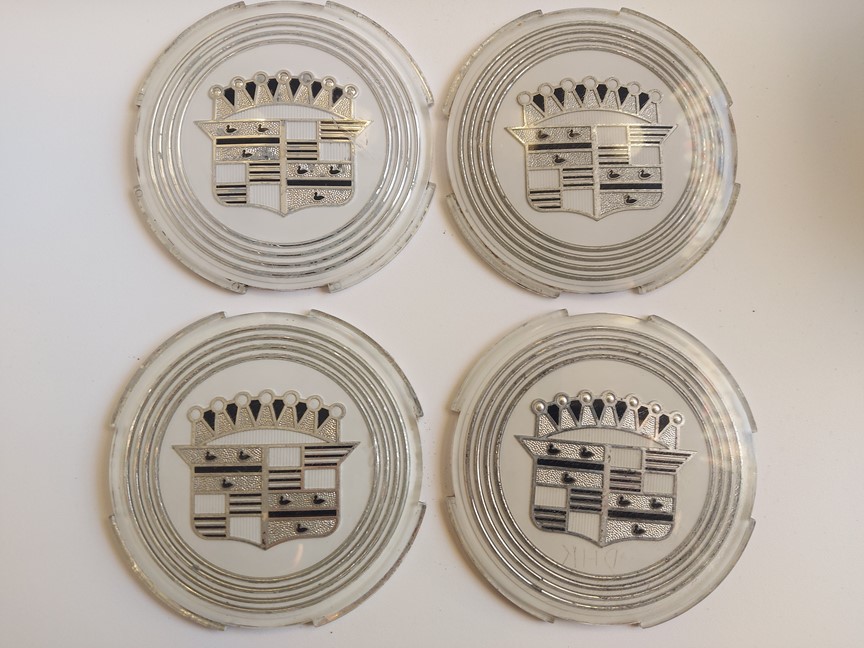 Mycket fina Eldorado och Fleetwood navkapselemblem 4000 kr. Nytillverkade fästen från växellådan till första rörklämmorna på avgassystemet 1000 kr. Dom blir guldförzinkade som org. Mycket fin askkopp bak cupe och cab 2000 kr. Det kommer mer bilder,även på nos delar.