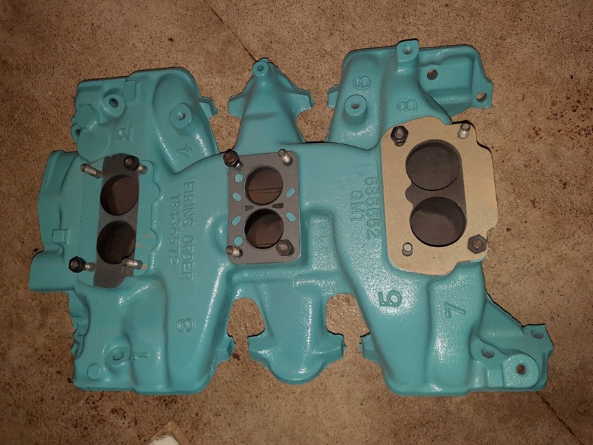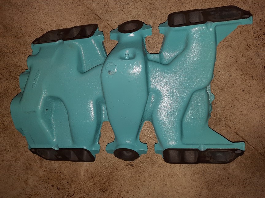 Ett fint blästrat och lackad insug för 1960 Pontiac Tri-Power. Gjutnummer 535552, datum E 8 0 85 1960. Röret för varmluft till choken inuti crossoverkanalen är intakt.
