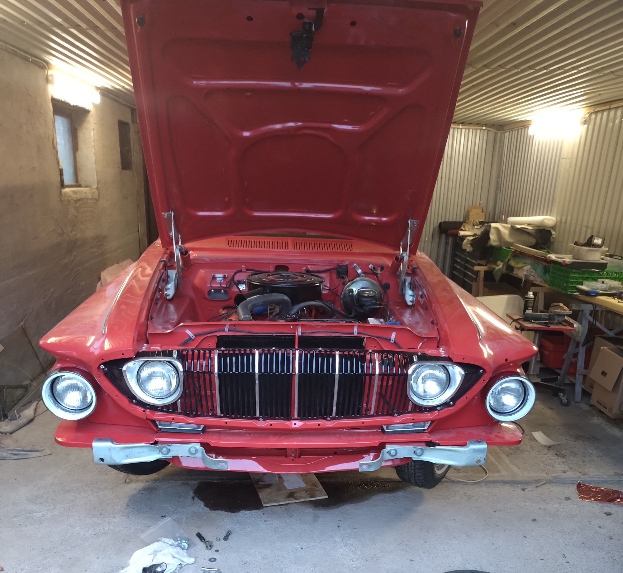 Har plockat av hela fronten och höger sida är ok , men vänster skärm är lagad men plåt ovanpå gamla skadan o poppnitad med mycket spackel gjort i USA … urdålig teknik se kort , men nu går det framåt igen ….